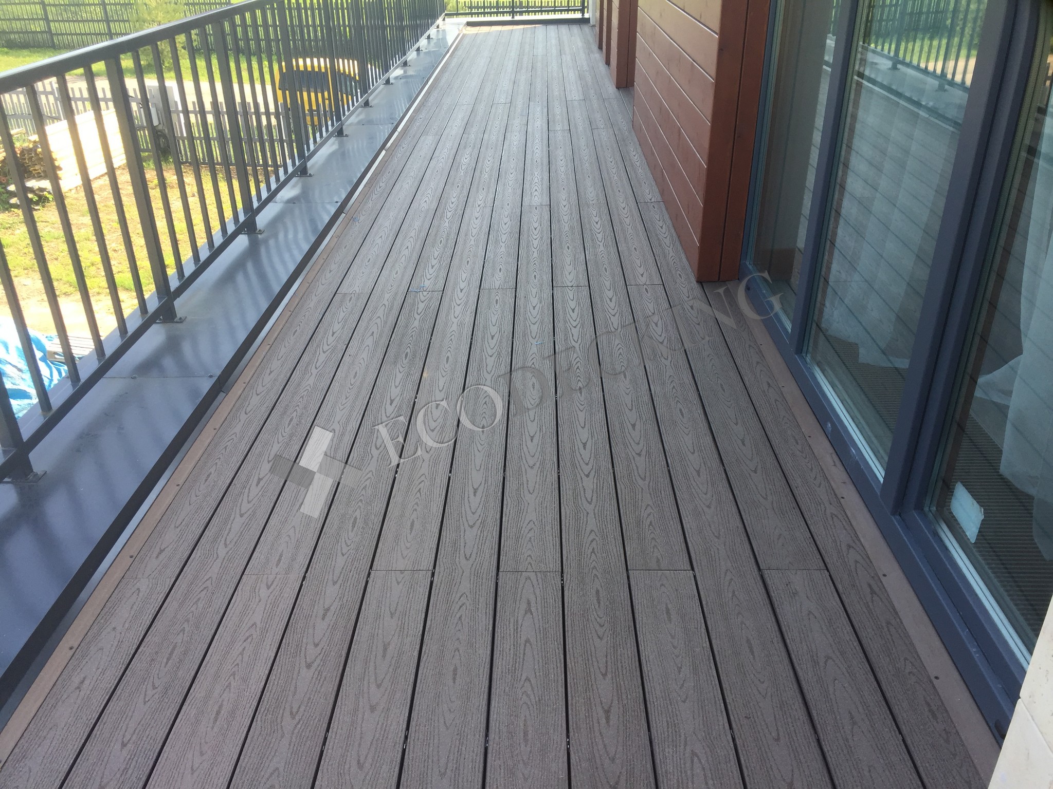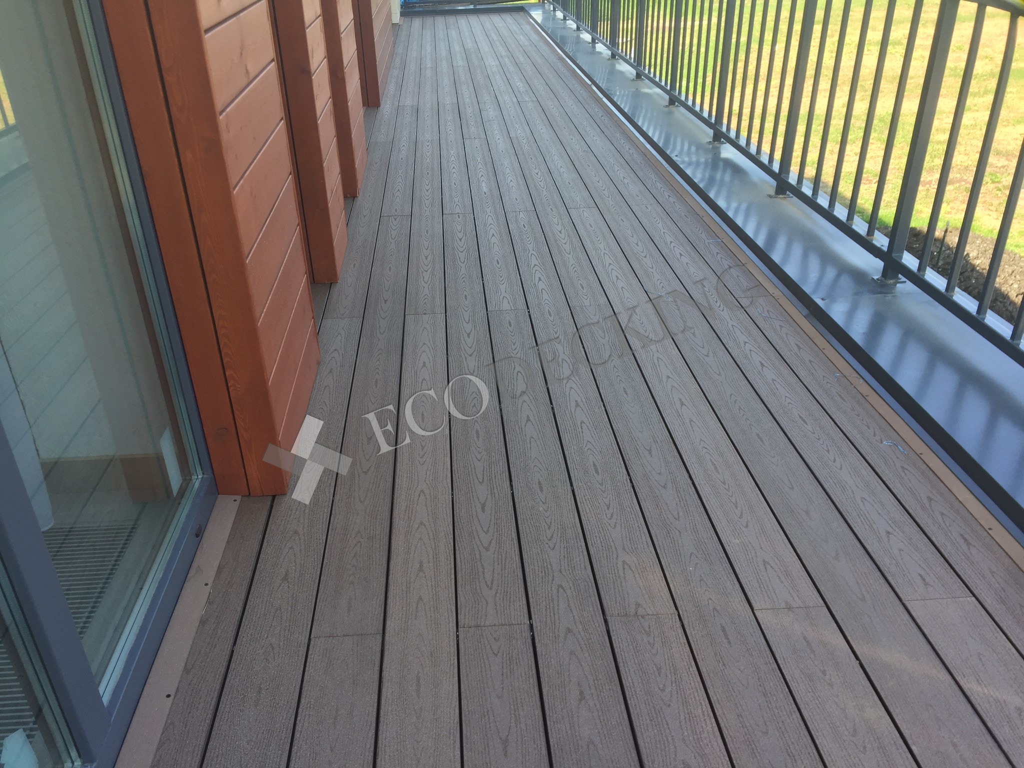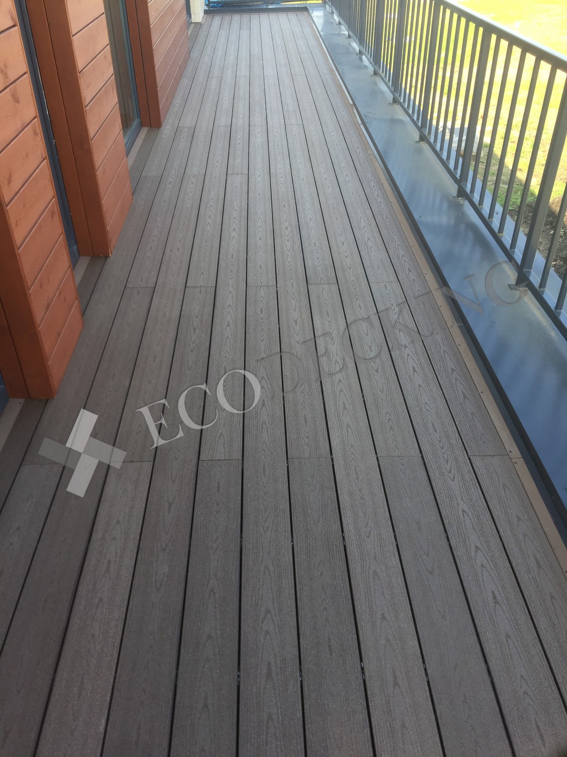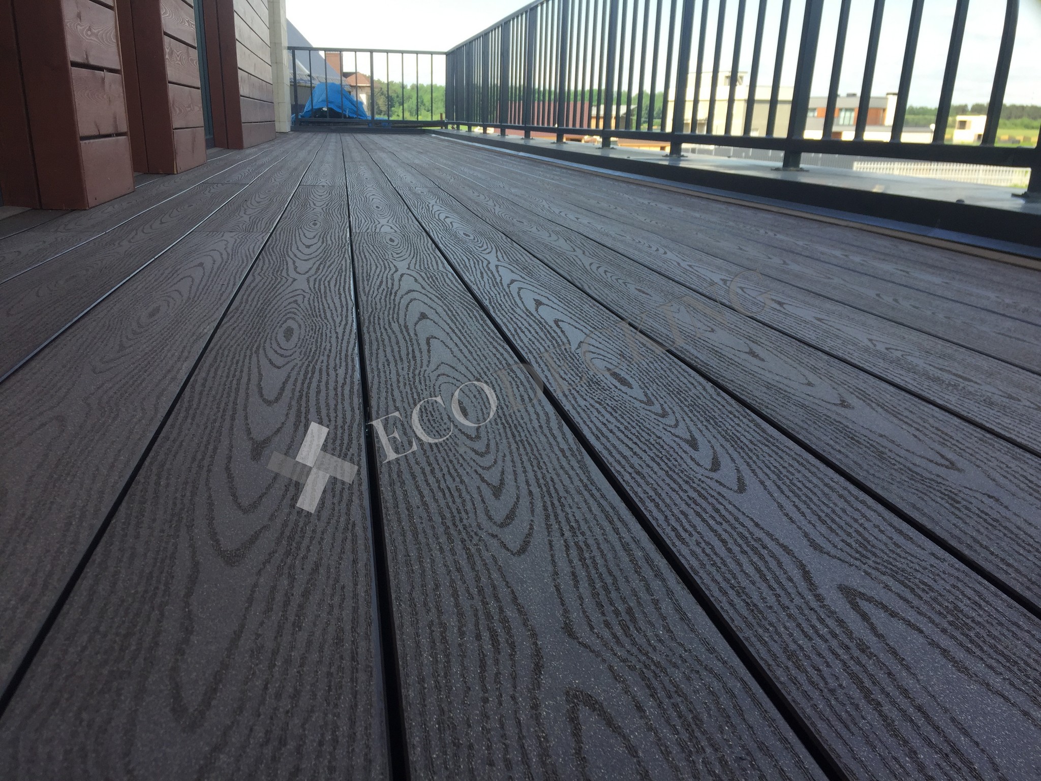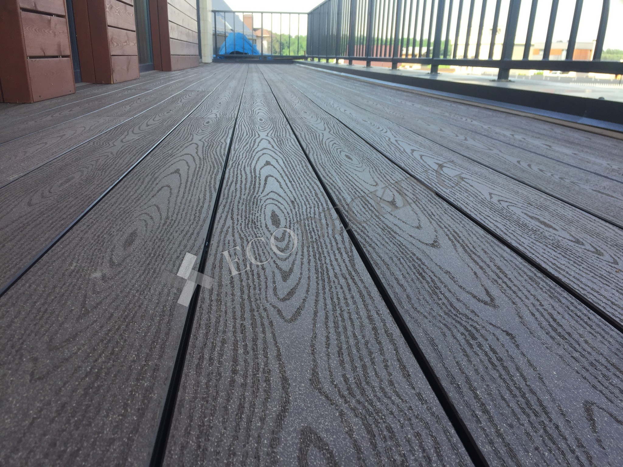 Балкон и входная группа из террасной доски дпк Ecodecking Техно цвета Шоколад. Монтаж выполнялся в городе Звенигород Московской области в августе 2020 года.