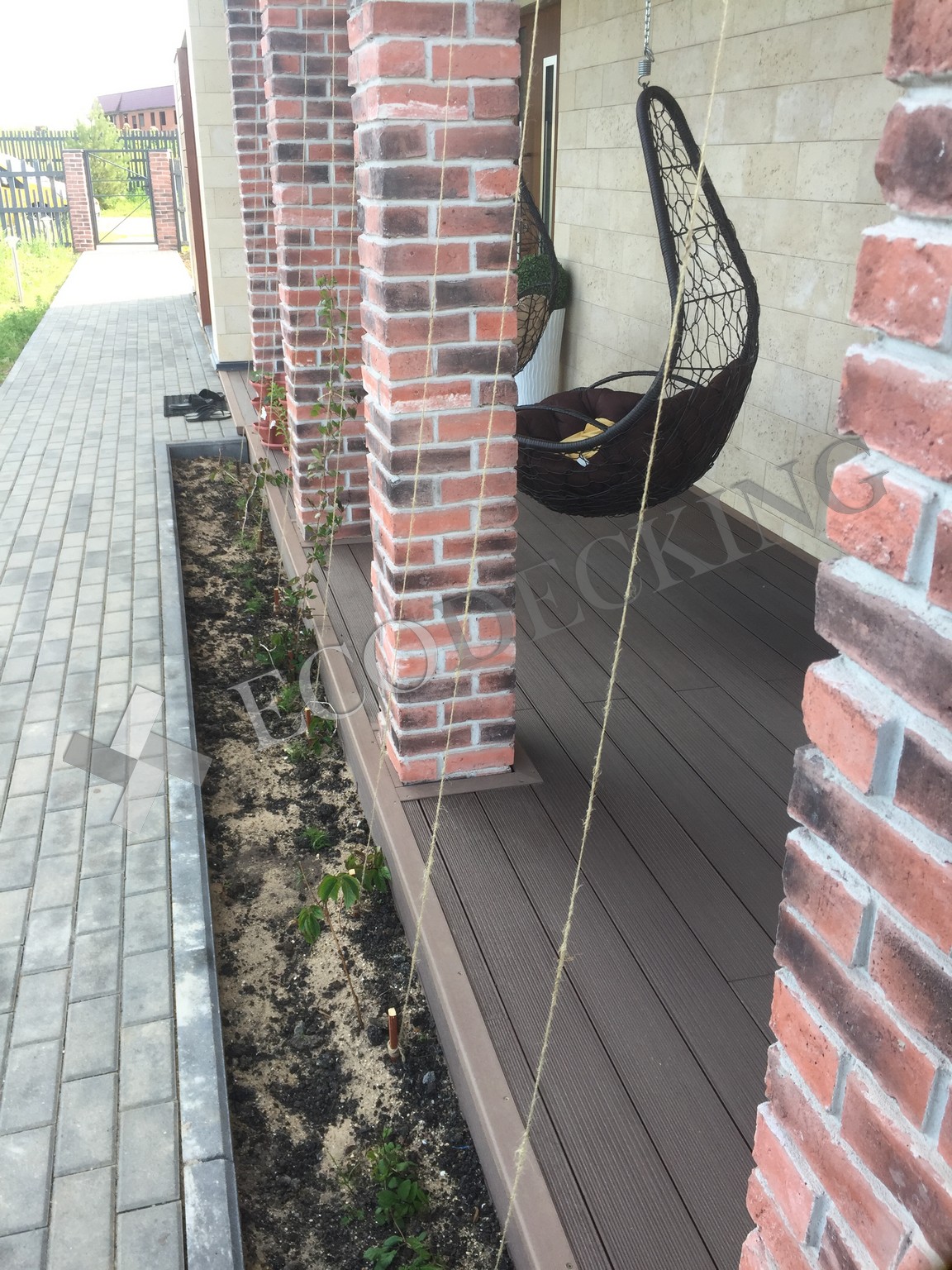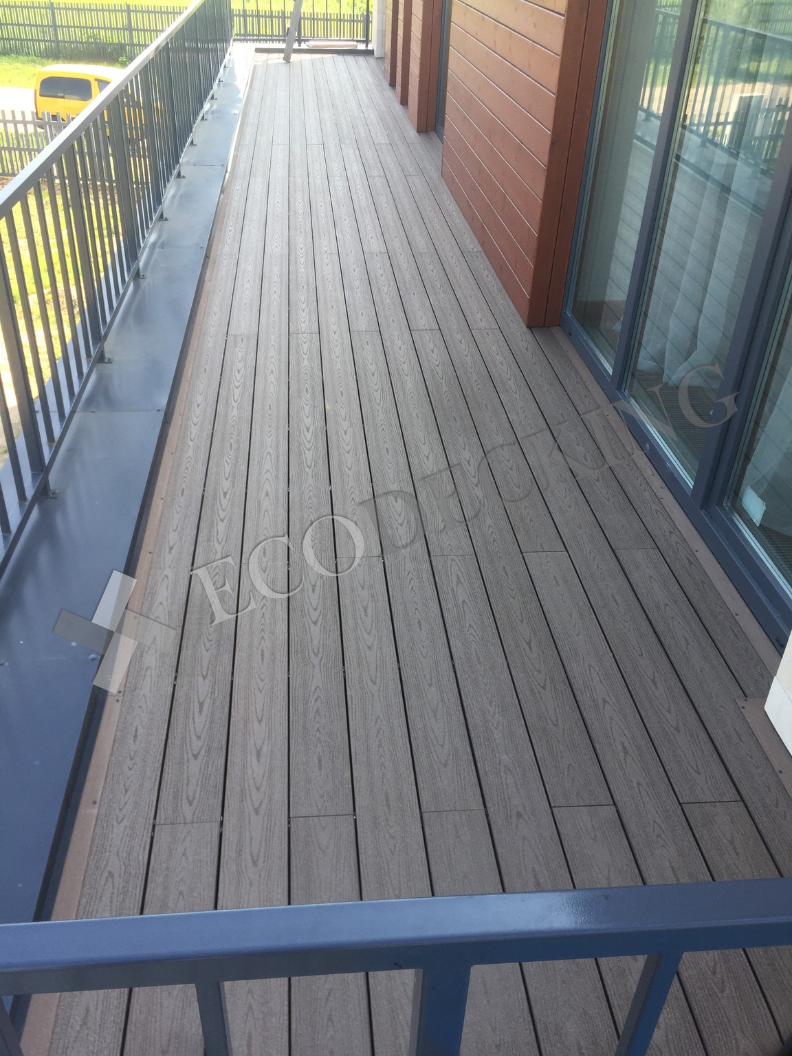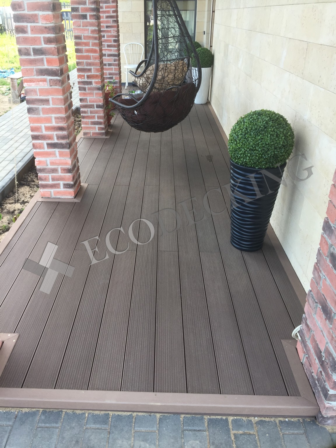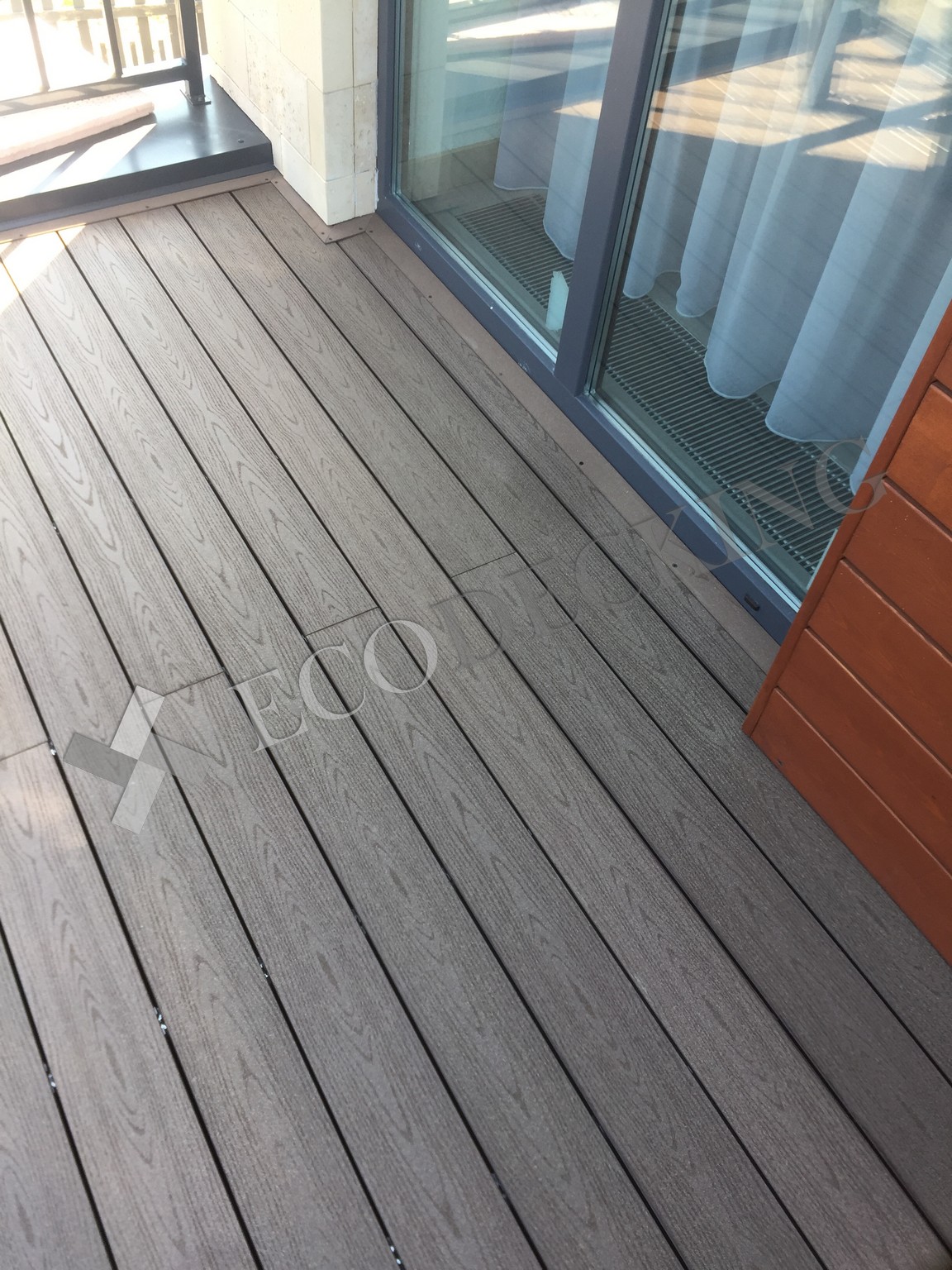 Балкон и входная группа из террасной доски дпк Ecodecking Техно цвета Шоколад. Монтаж выполнялся в городе Звенигород Московской области в августе 2020 года.