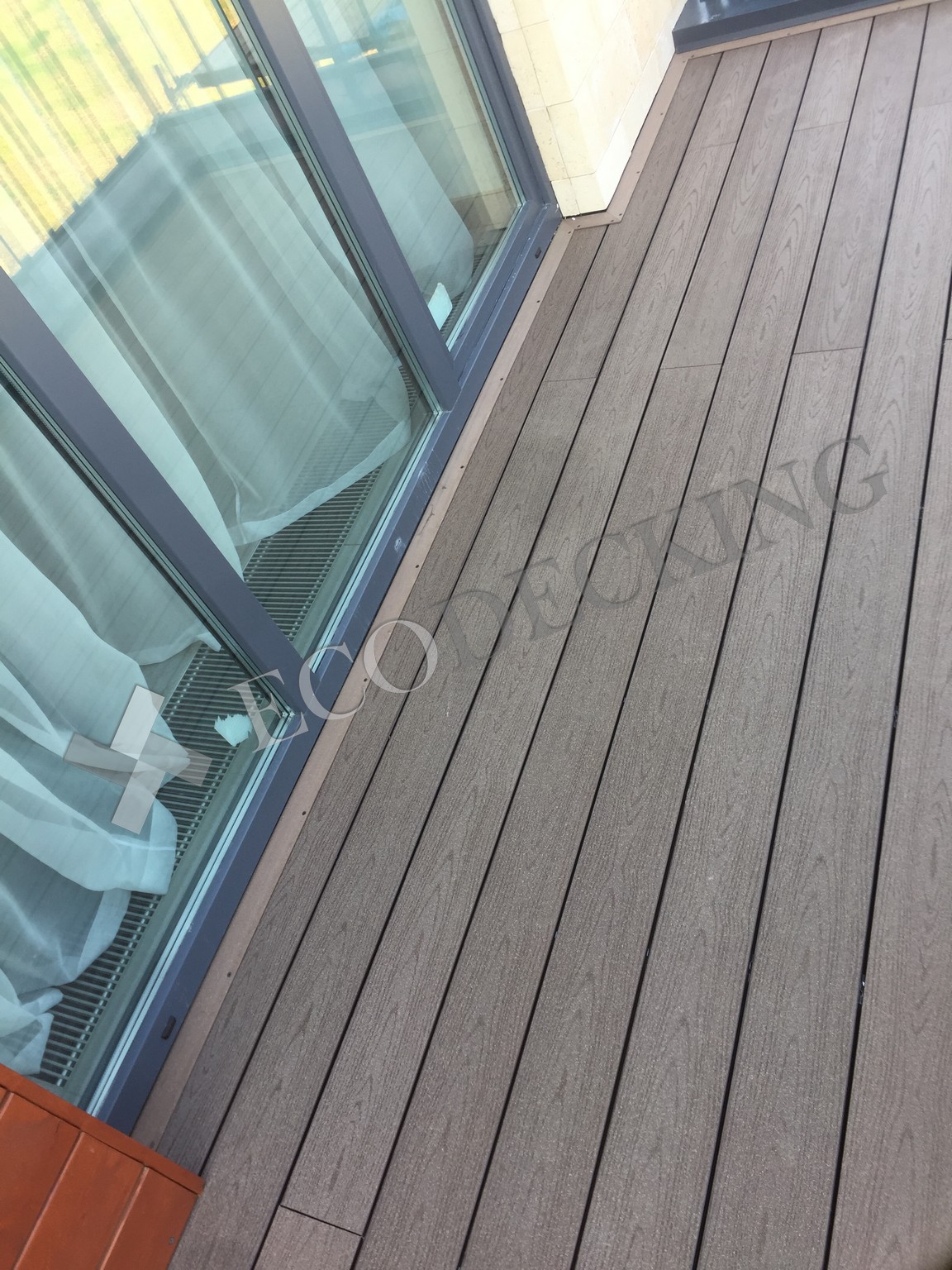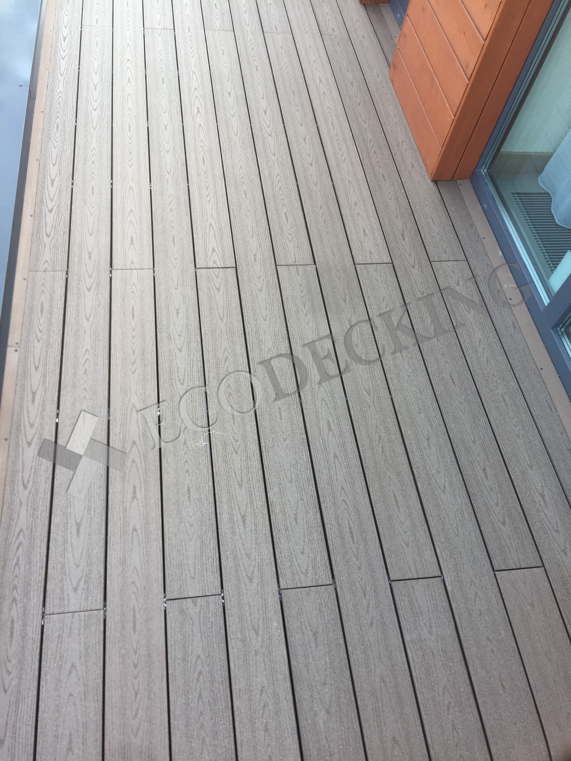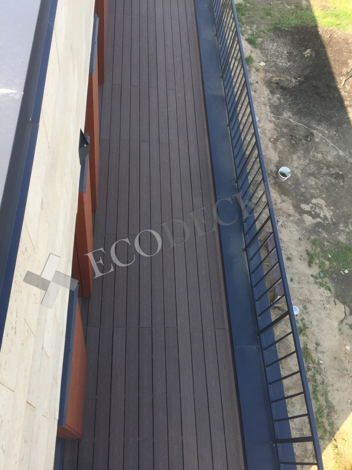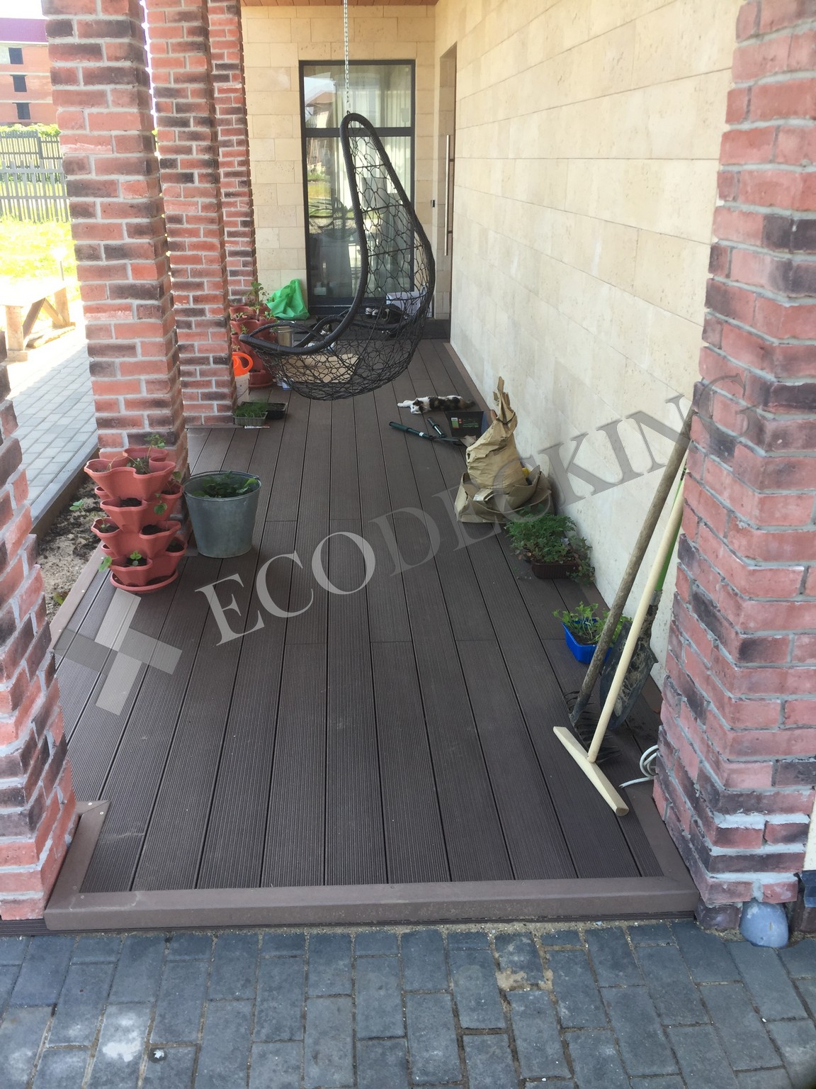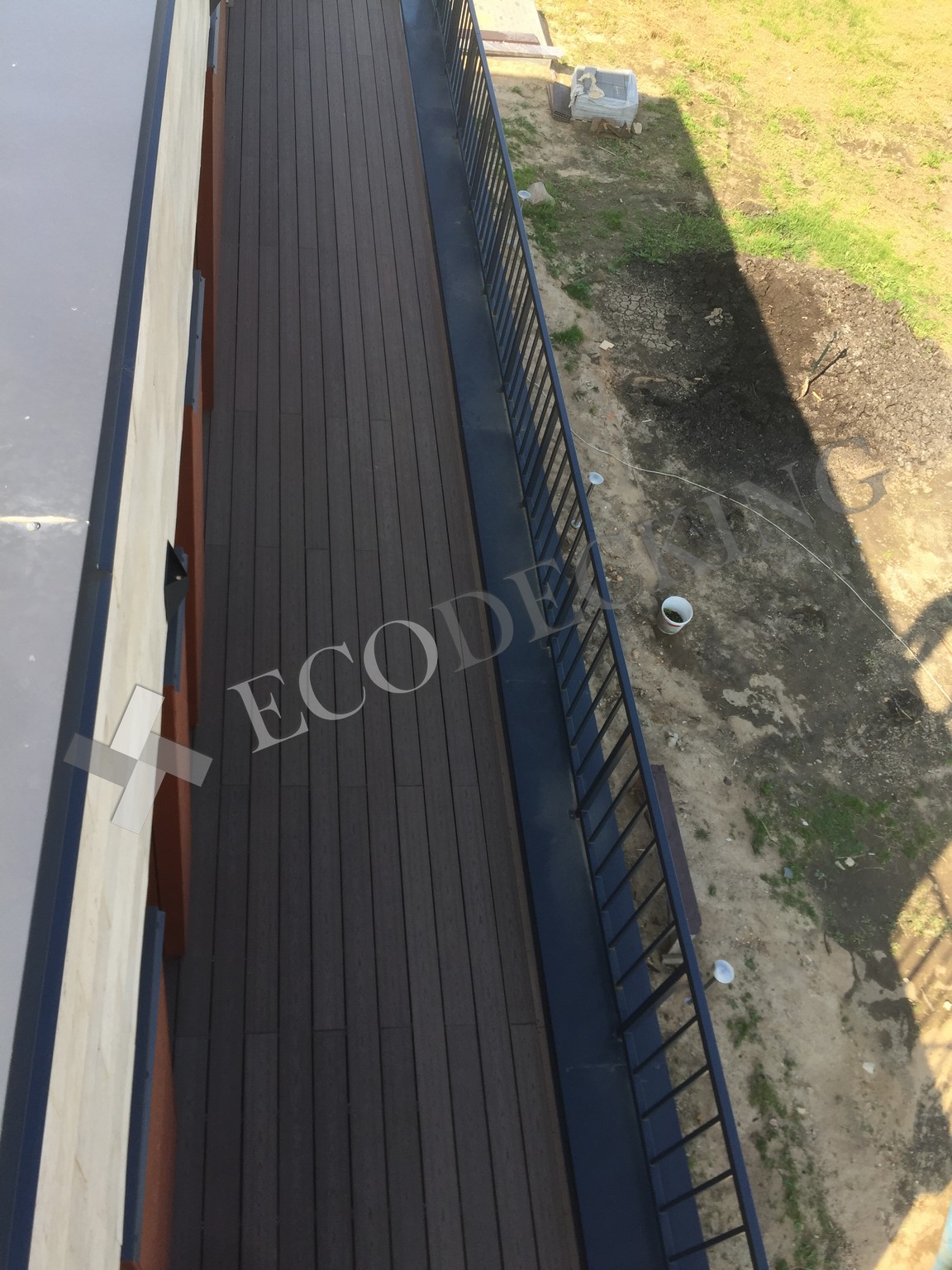 Балкон и входная группа из террасной доски дпк Ecodecking Техно цвета Шоколад. Монтаж выполнялся в городе Звенигород Московской области в августе 2020 года.