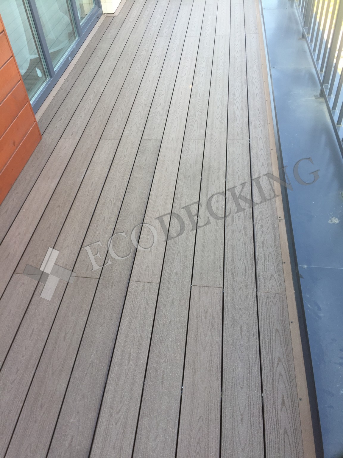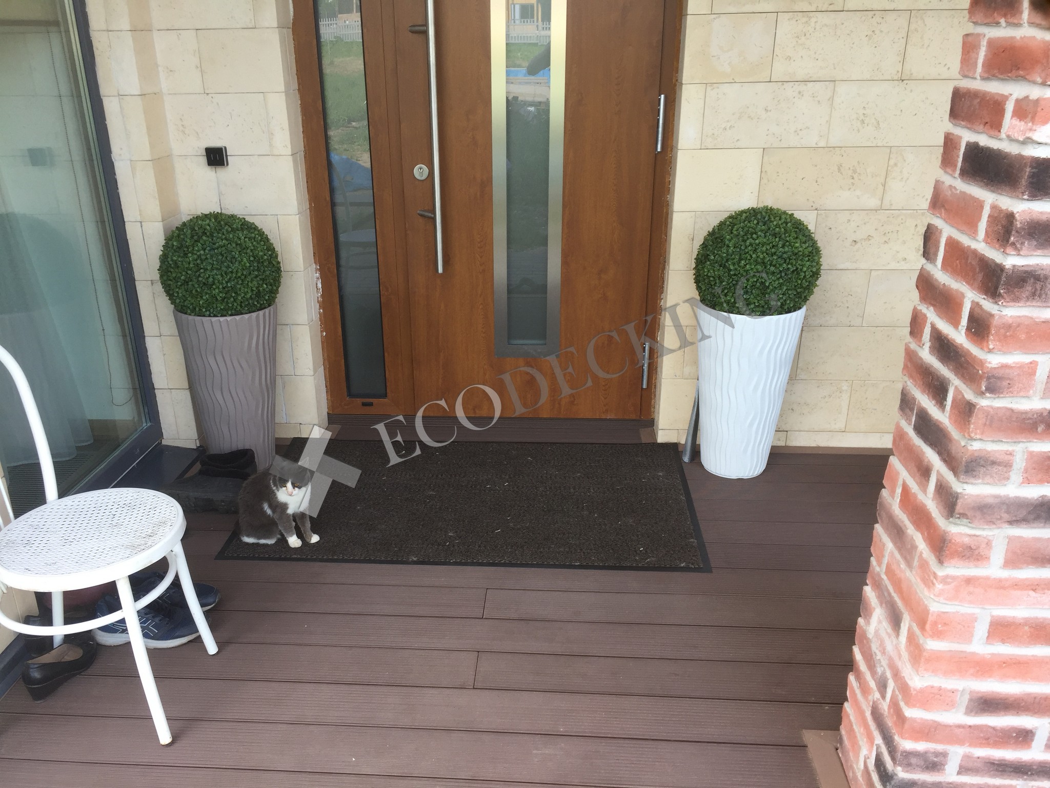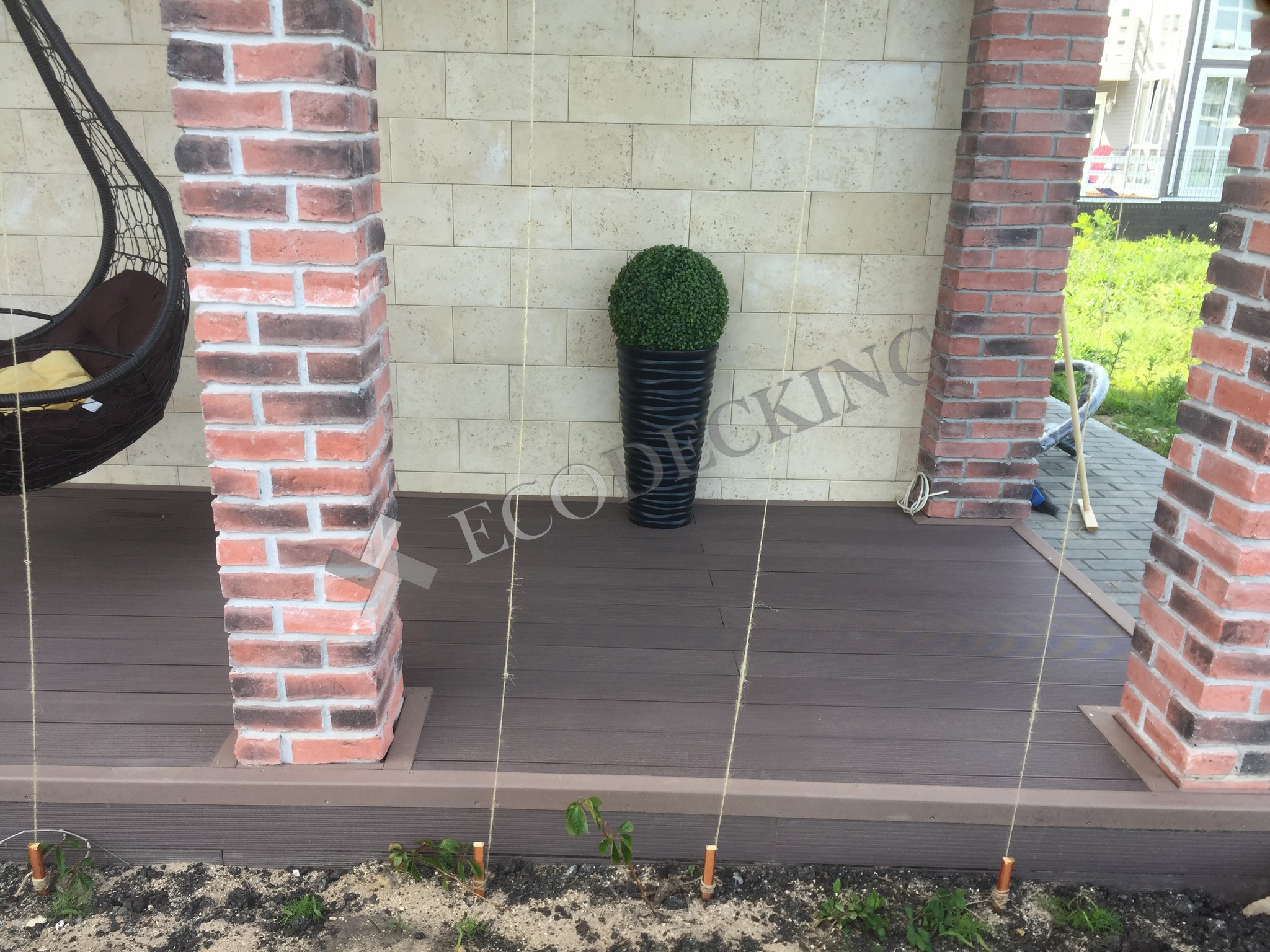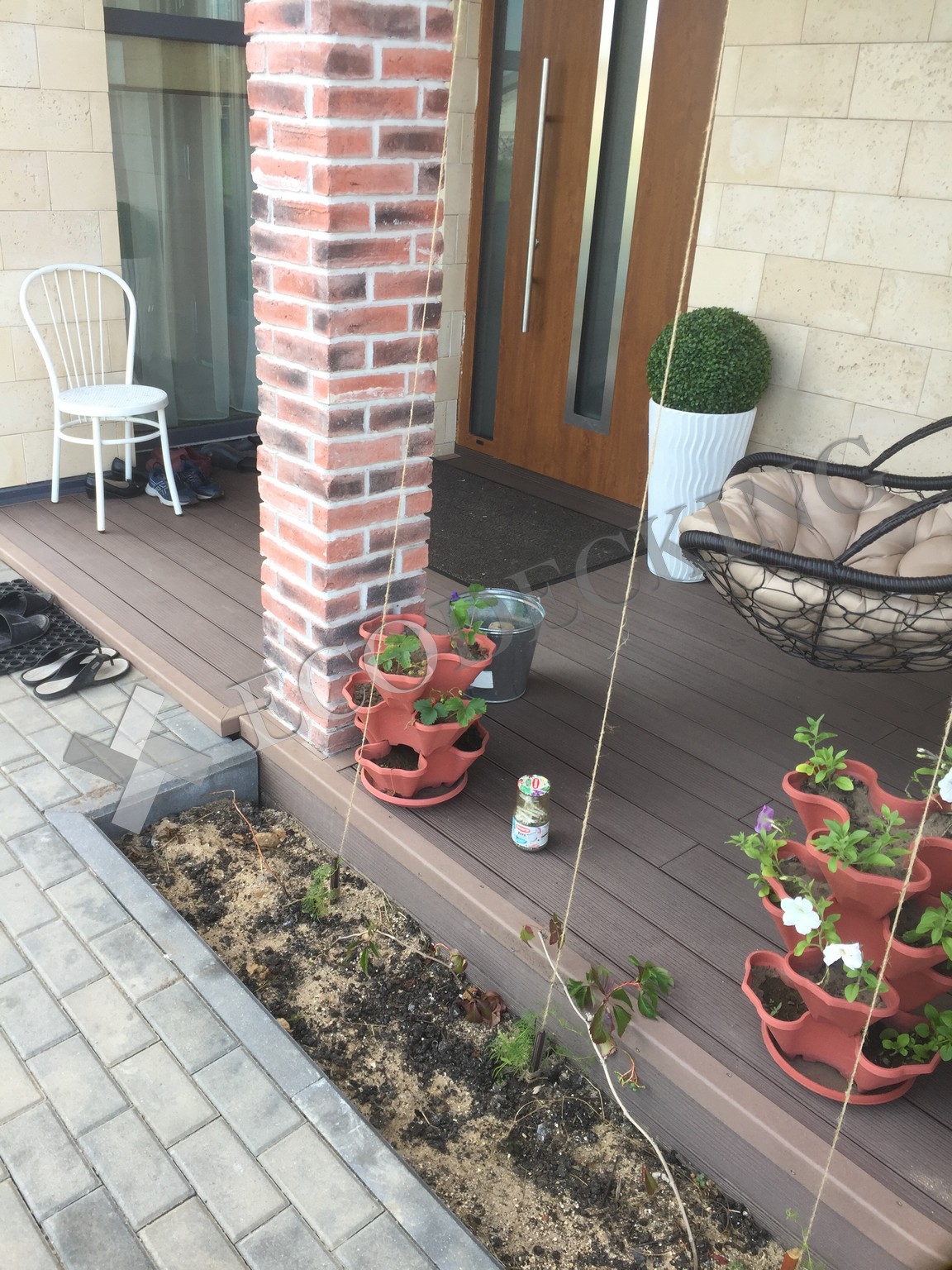 Балкон и входная группа из террасной доски дпк Ecodecking Техно цвета Шоколад. Монтаж выполнялся в городе Звенигород Московской области в августе 2020 года.