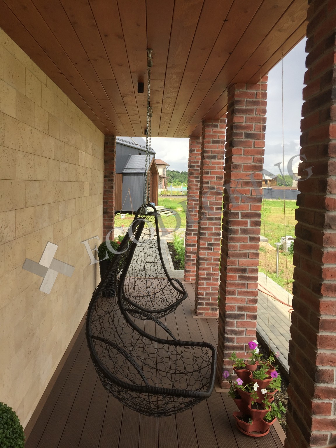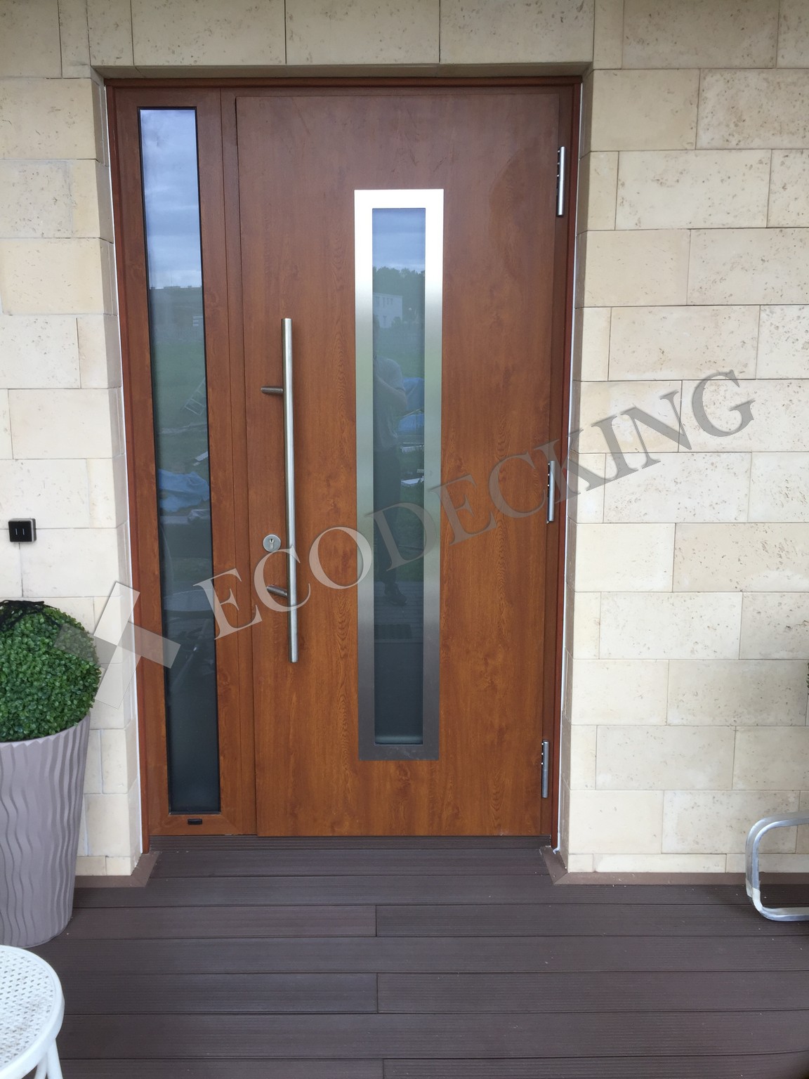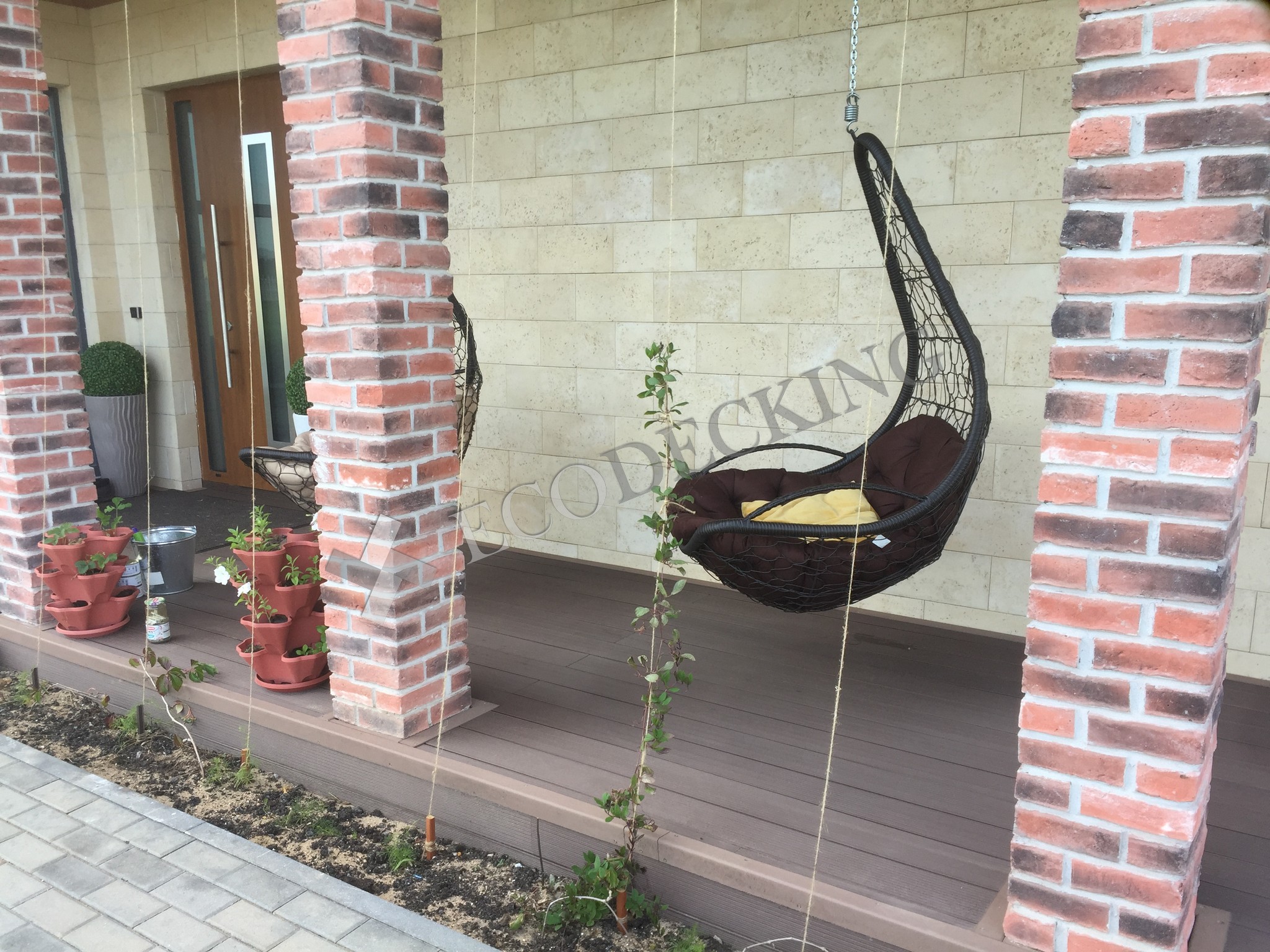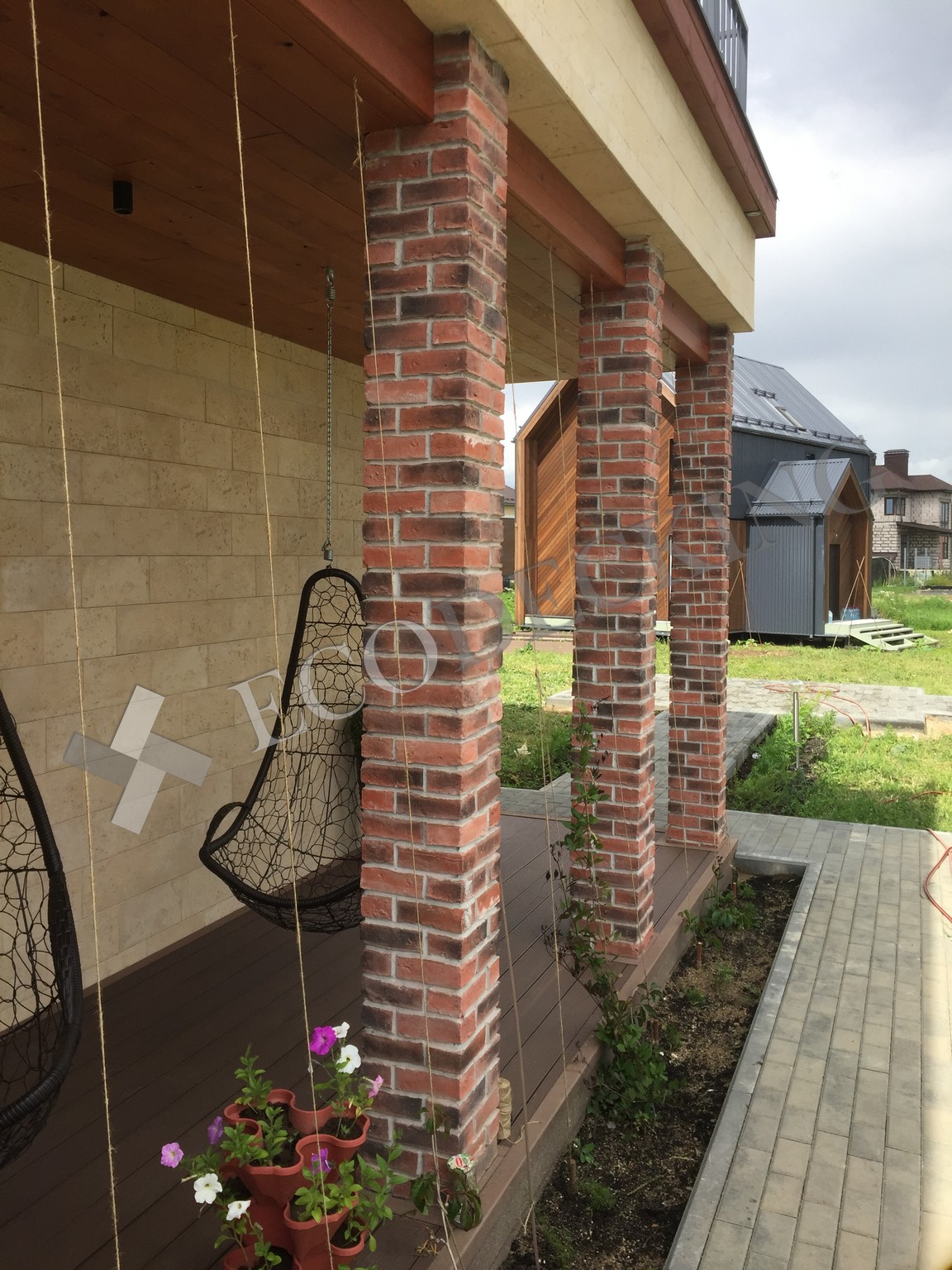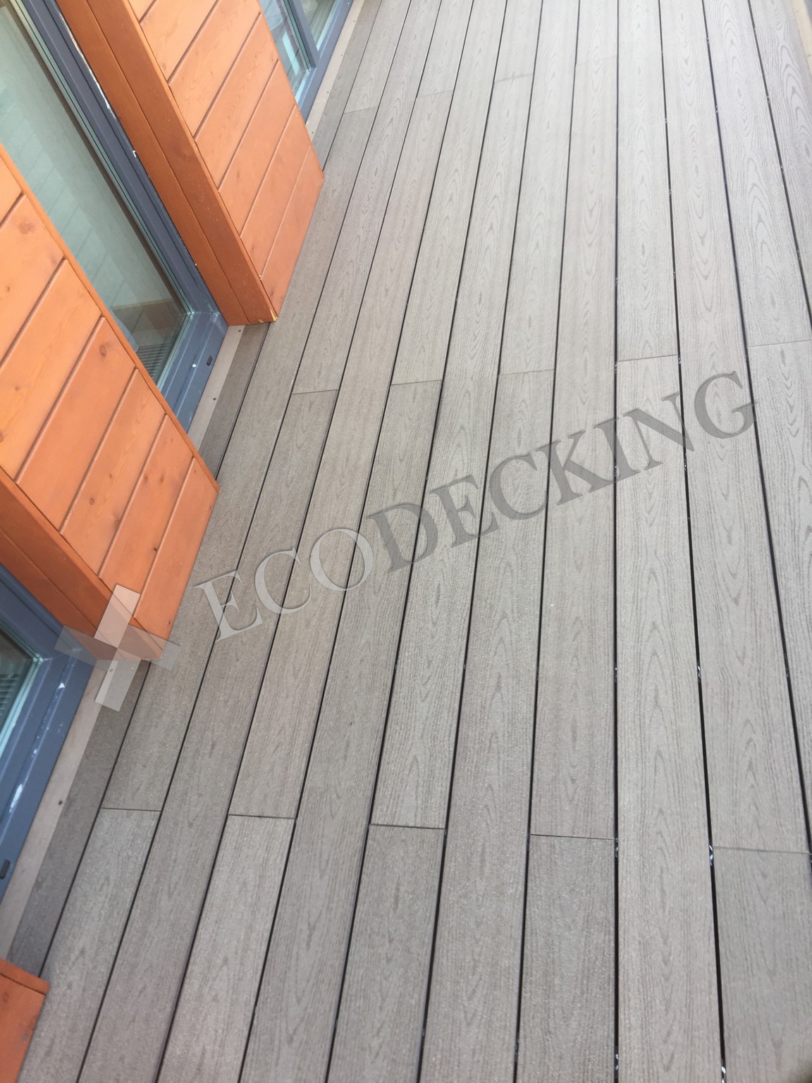 Балкон и входная группа из террасной доски дпк Ecodecking Техно цвета Шоколад. Монтаж выполнялся в городе Звенигород Московской области в августе 2020 года.