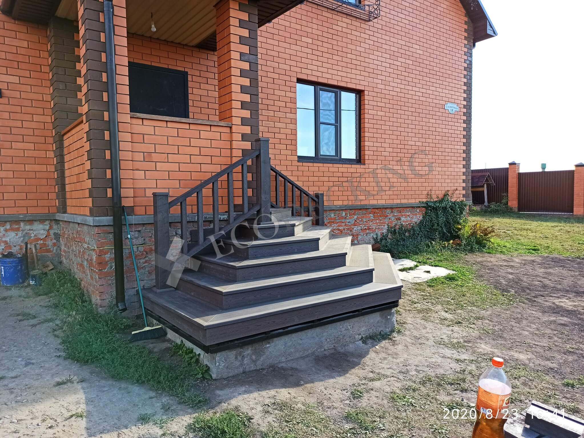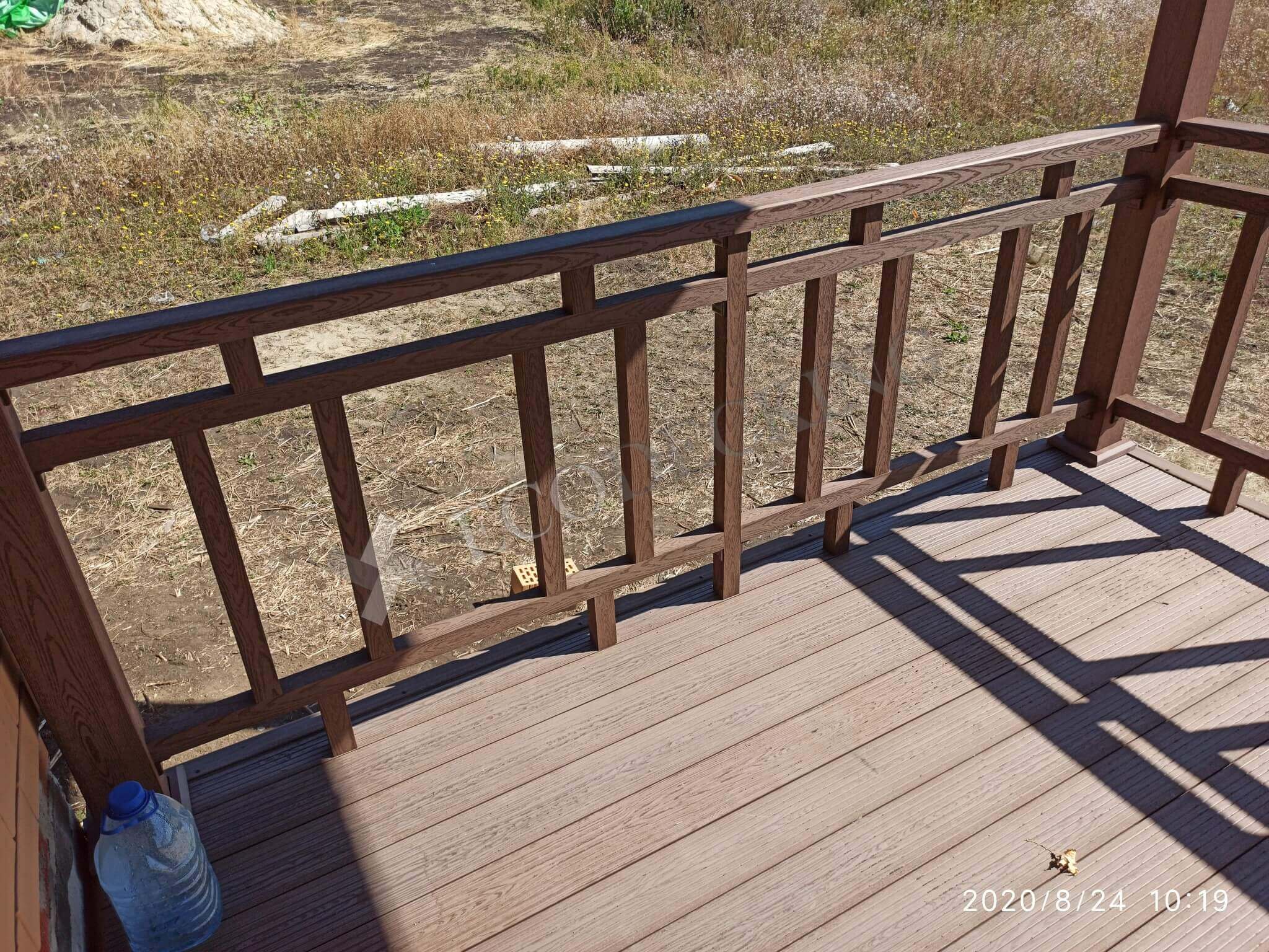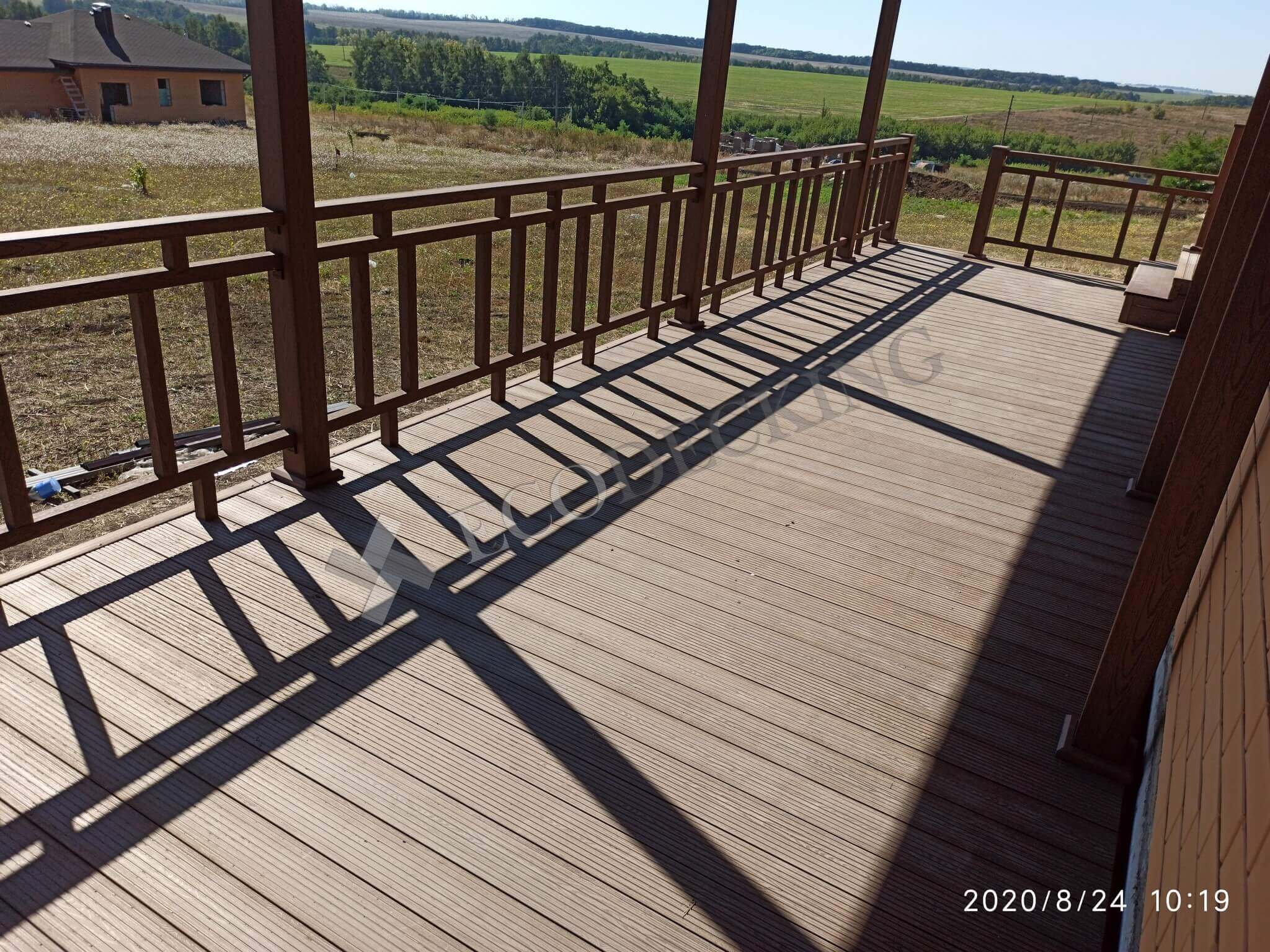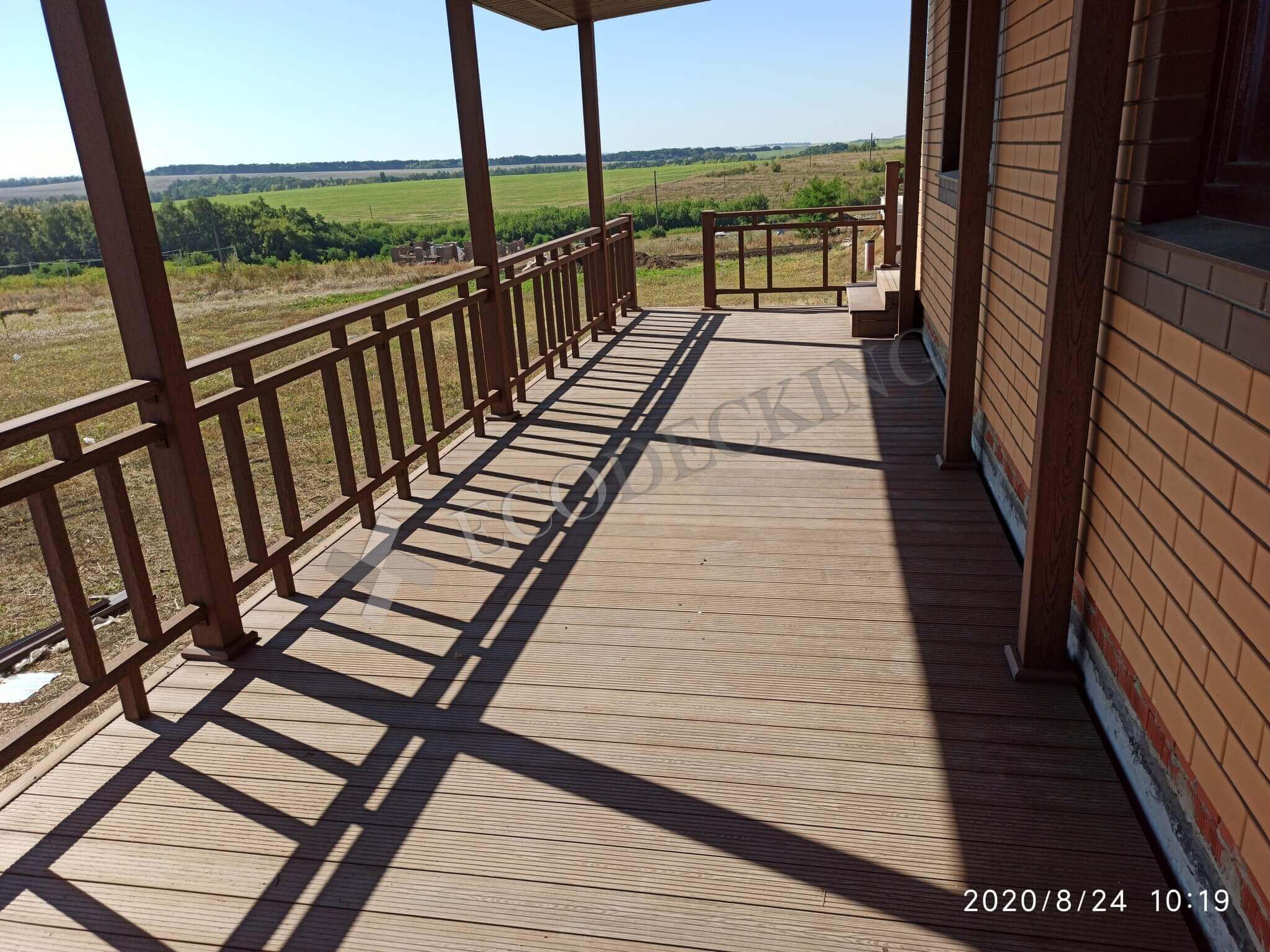 Монтаж данного объекта производился в городе Белгород. Материал использовался: террасная доска Ecodecking Praktik цвета шоколад, ступени Ecodecking пустотелые, ограждения Ecodecking цвет коричневый. Клиент попросил выполнить нестандартную сборку ограждения. Задача была выполнена в полом объеме. Ограждения идеально вписались в концепцию уличной крытой террасы.