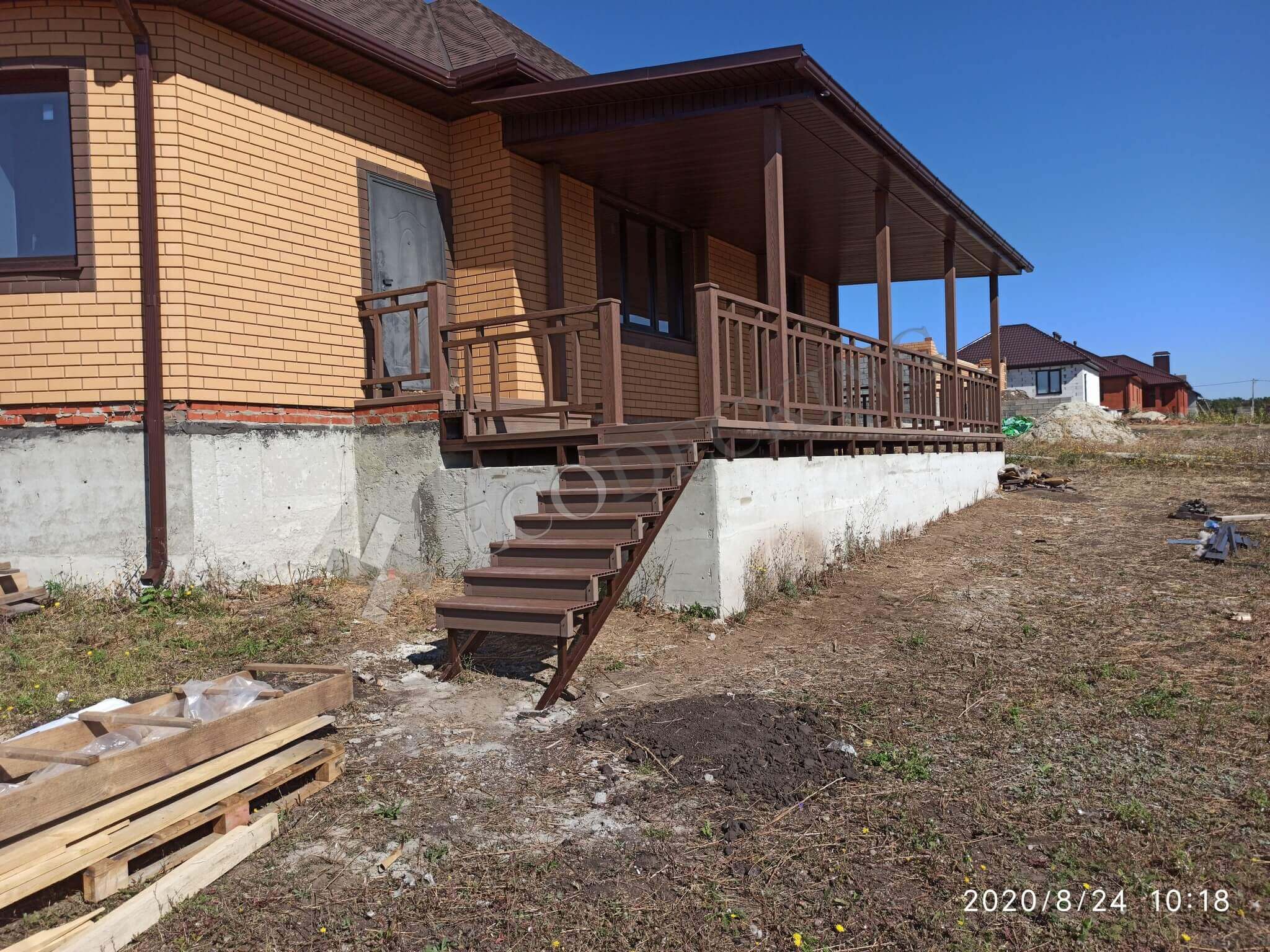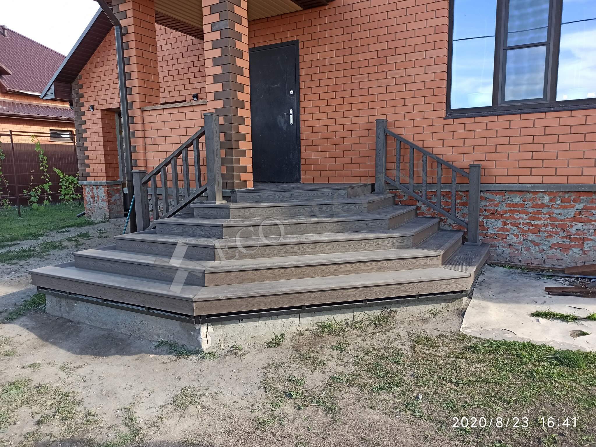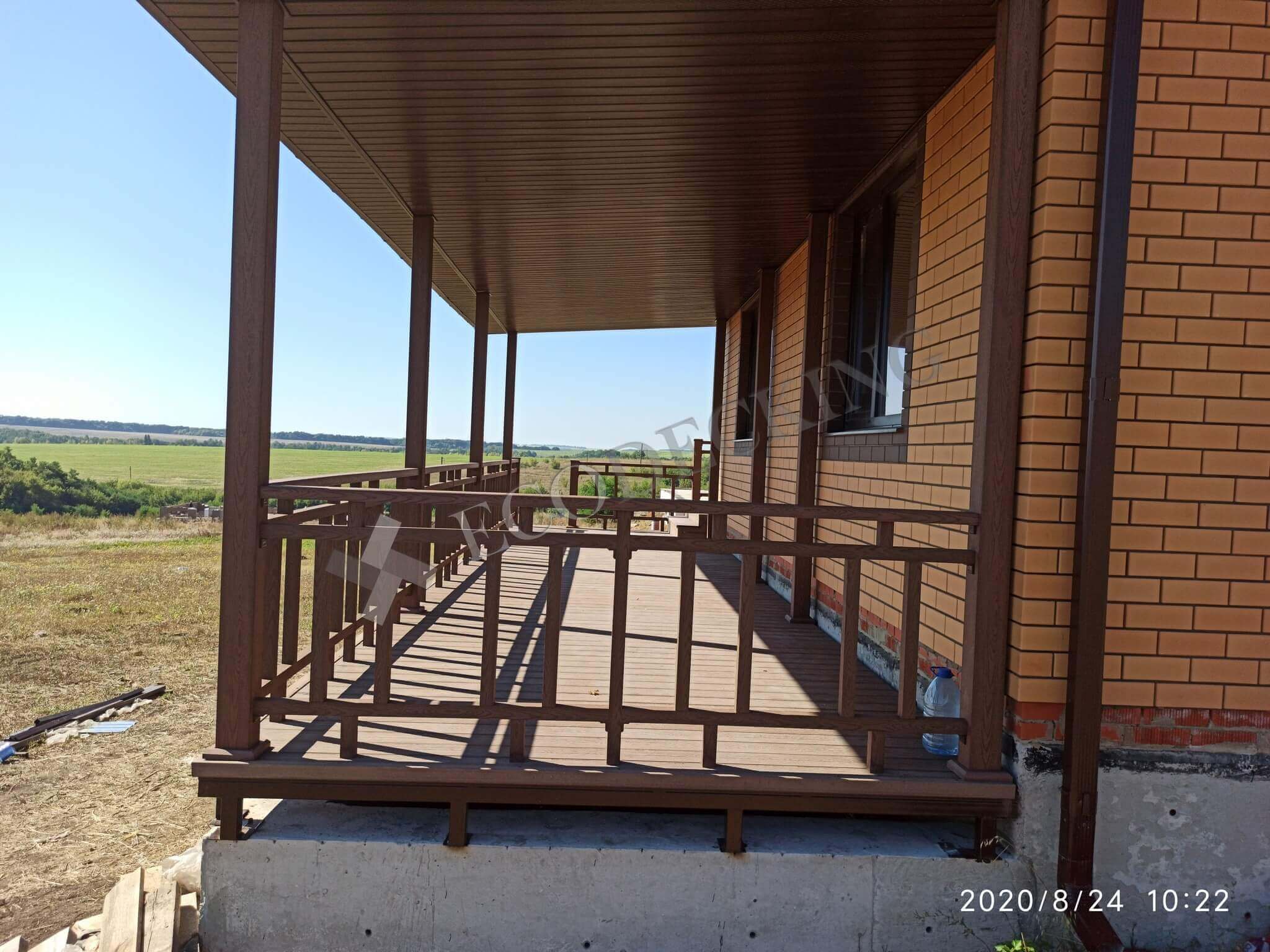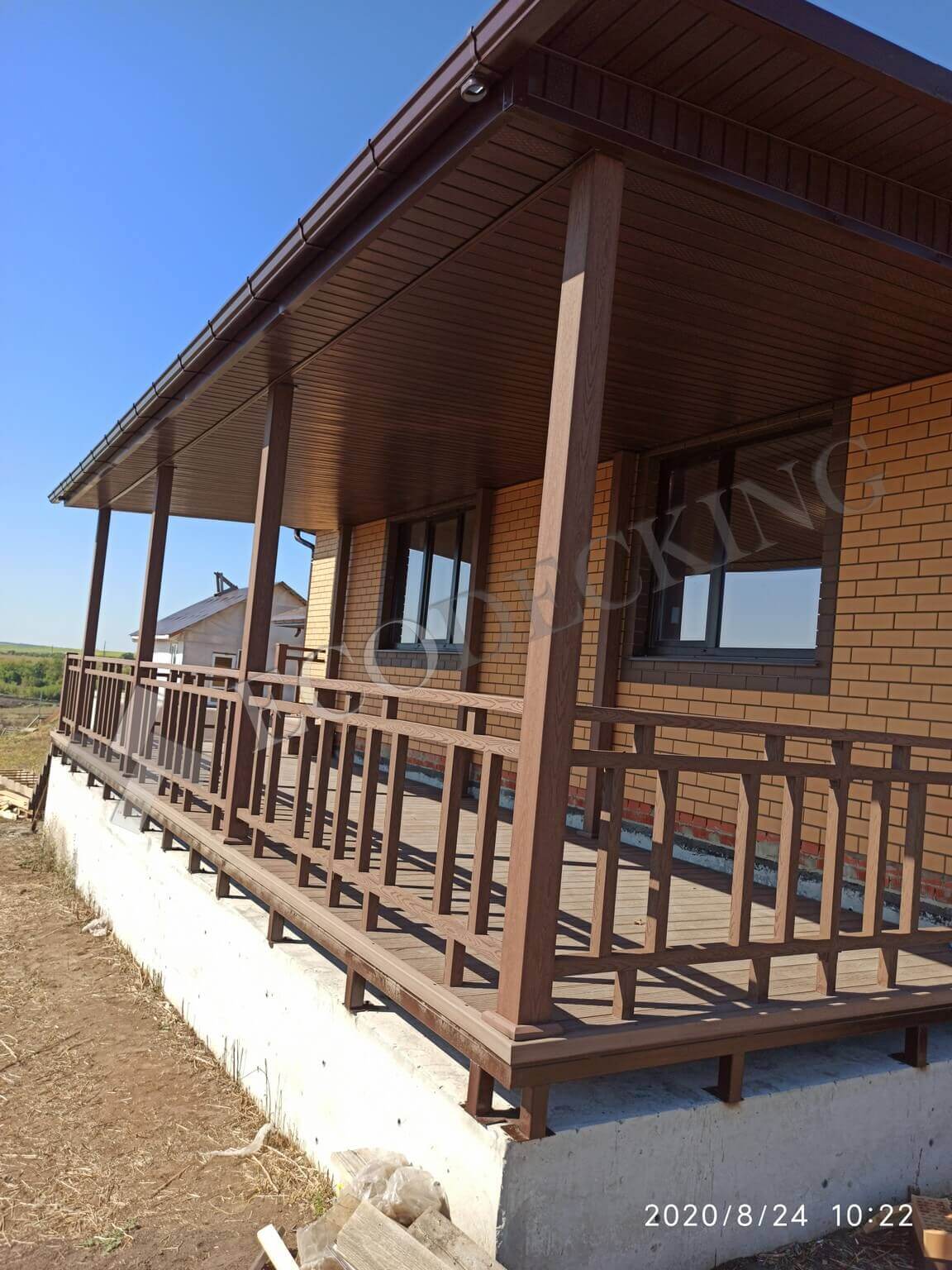 Монтаж данного объекта производился в городе Белгород. Материал использовался: террасная доска Ecodecking Praktik цвета шоколад, ступени Ecodecking пустотелые, ограждения Ecodecking цвет коричневый. Клиент попросил выполнить нестандартную сборку ограждения. Задача была выполнена в полом объеме. Ограждения идеально вписались в концепцию уличной крытой террасы.