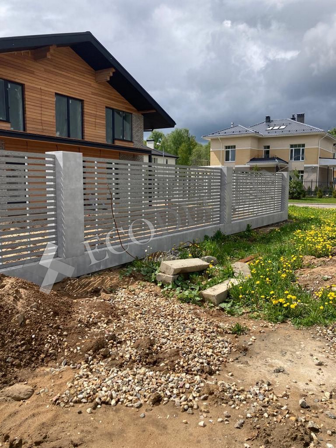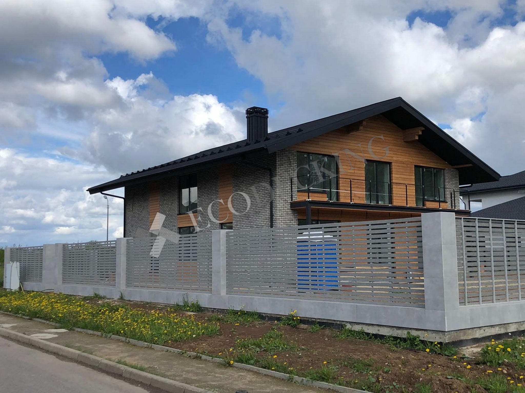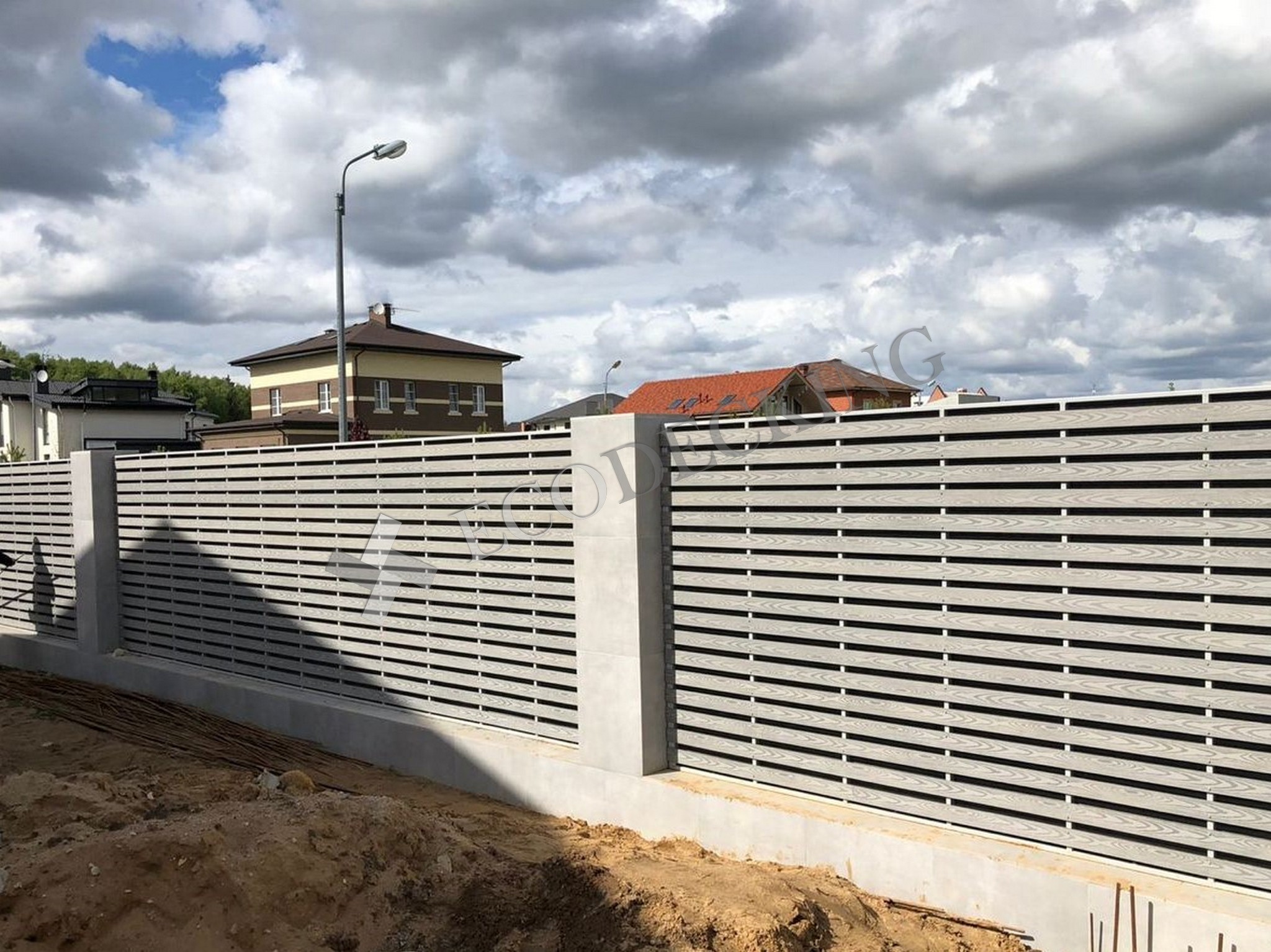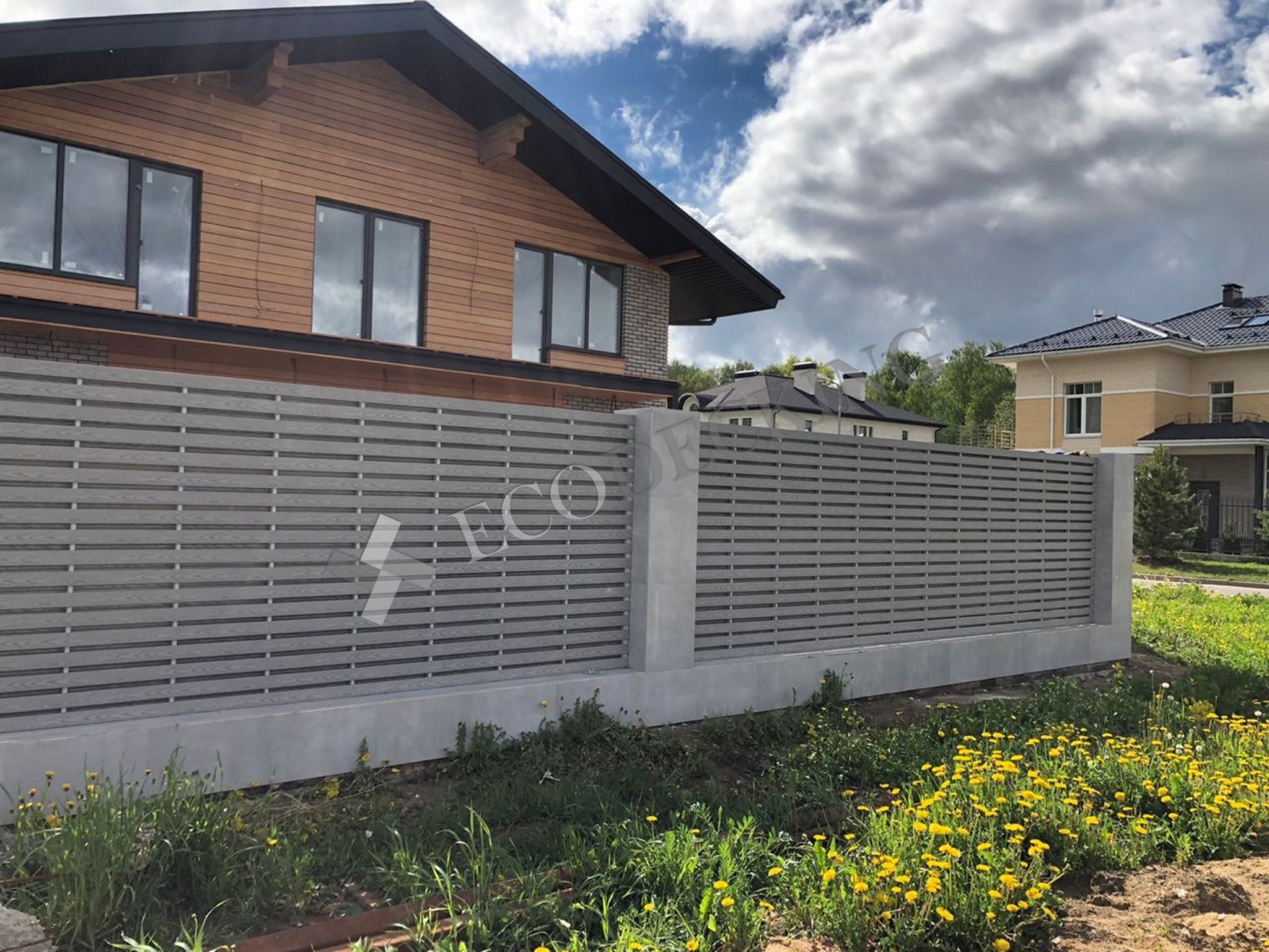 Штакетник Ecodecking Классик цвет серый с двусторонней обработкой под дерево. Монтаж забора был выполнен в пос. Сосенское в мае 2022 года.