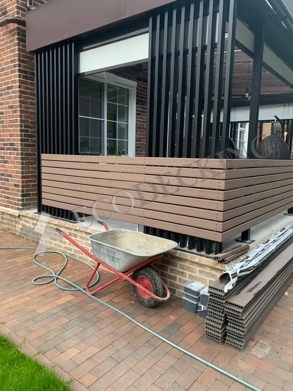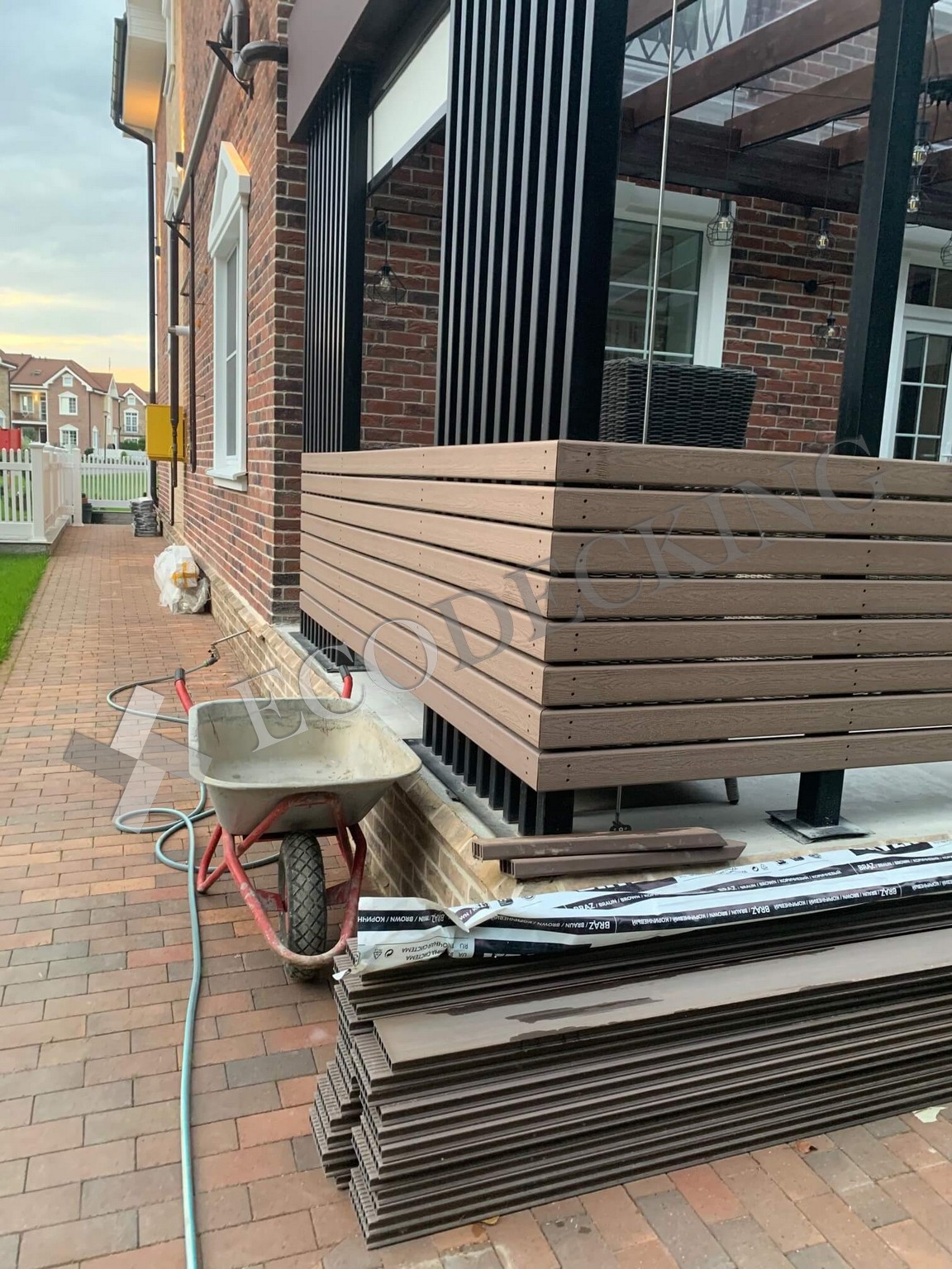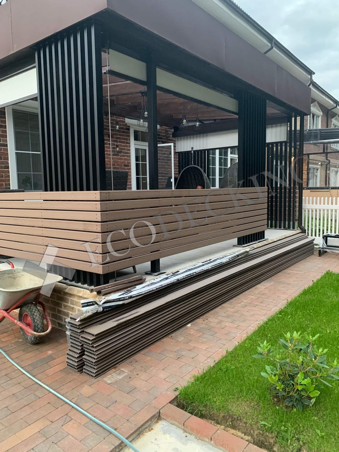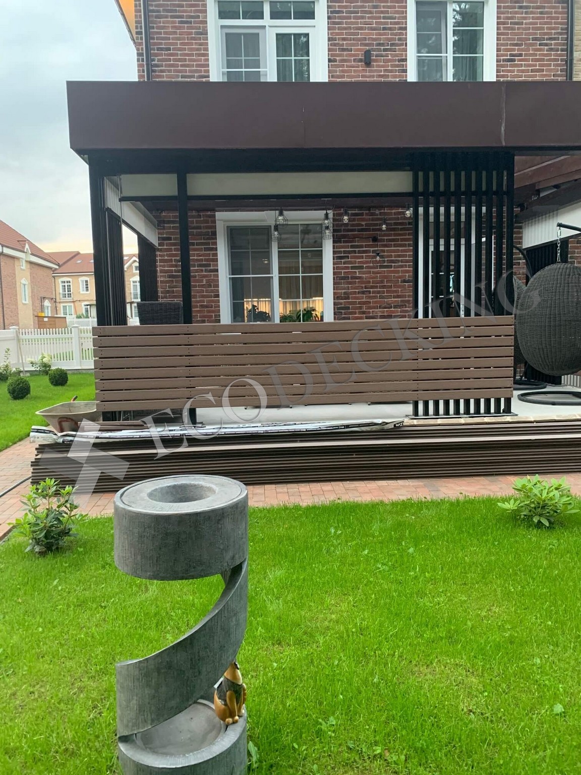 Открытой площадке необходимо качественное покрытие. Террасная доска или декинг - лучшее решение для устройства напольных покрытий на открытом воздухе. На этом объекте мы использовали ECODECKING Практик цвета “Шоколад” для пола и для монтажа горизонтальных ограждений.