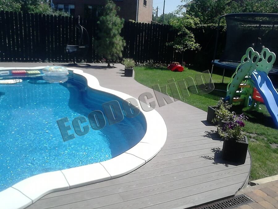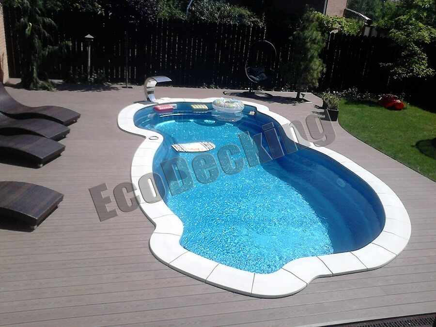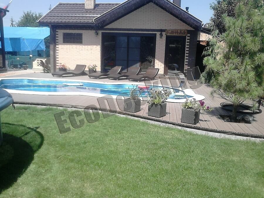 Декинг все чаще применяют для обустройства территории около бассейна. На данном объекте использовалась террасная доска ECODECKING коричневого цвета «Терракот», способ обработки — «тиснение» под дерево.