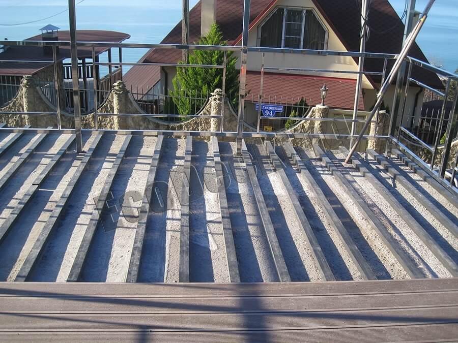 Подсистема собрана из монтажной лаги на опорах с учетом разуклонки кровли.