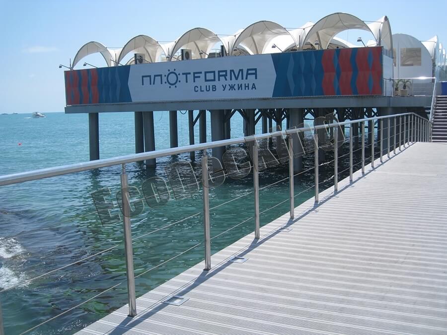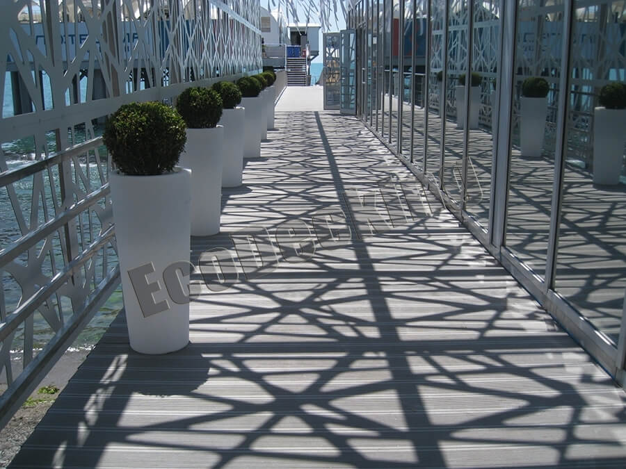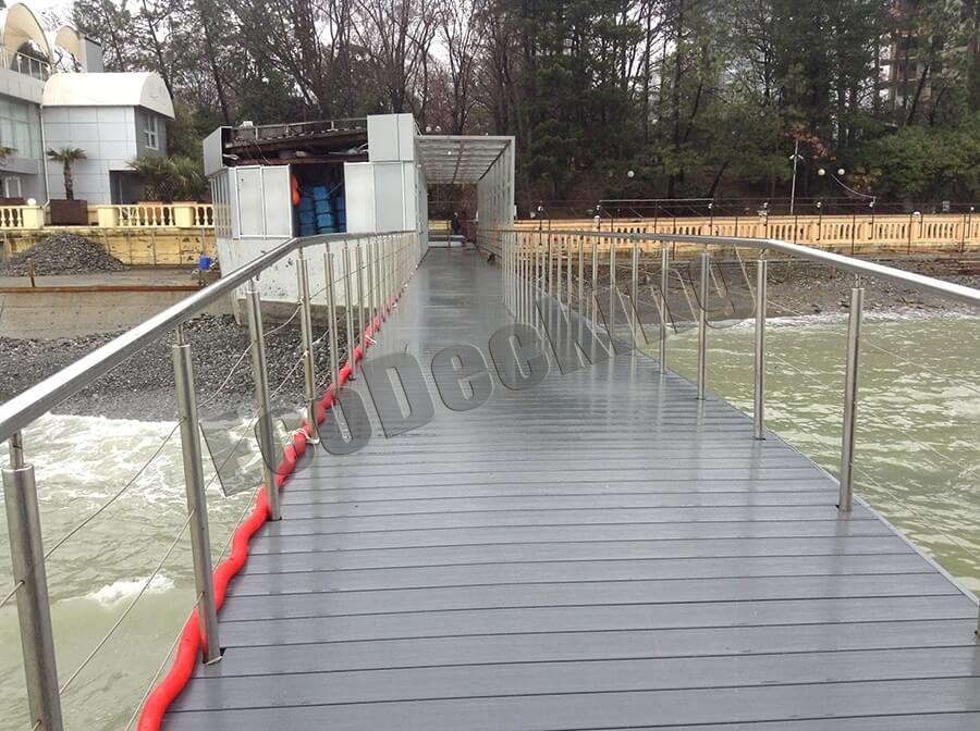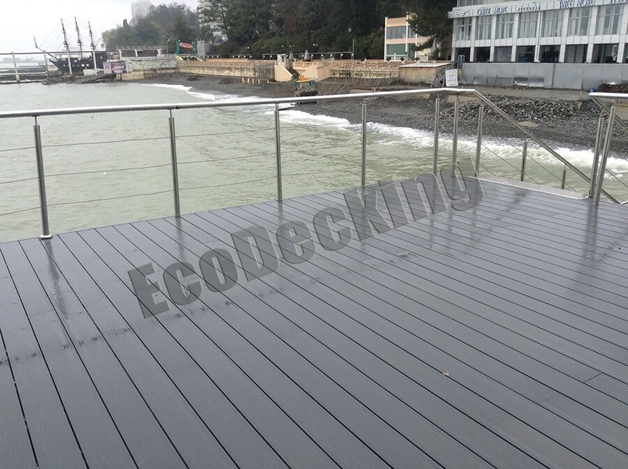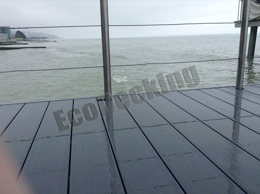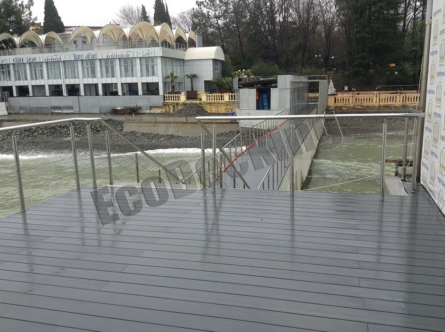 Несмотря на агрессивные условия (побережье моря) и интенсивную эксплуатацию (перевозка грузов на тележках), террасная доска лежит и выглядит достойно. Это еще раз показывает, как нужно серьезно относиться к выбору декинга и особенно качественному монтажу.