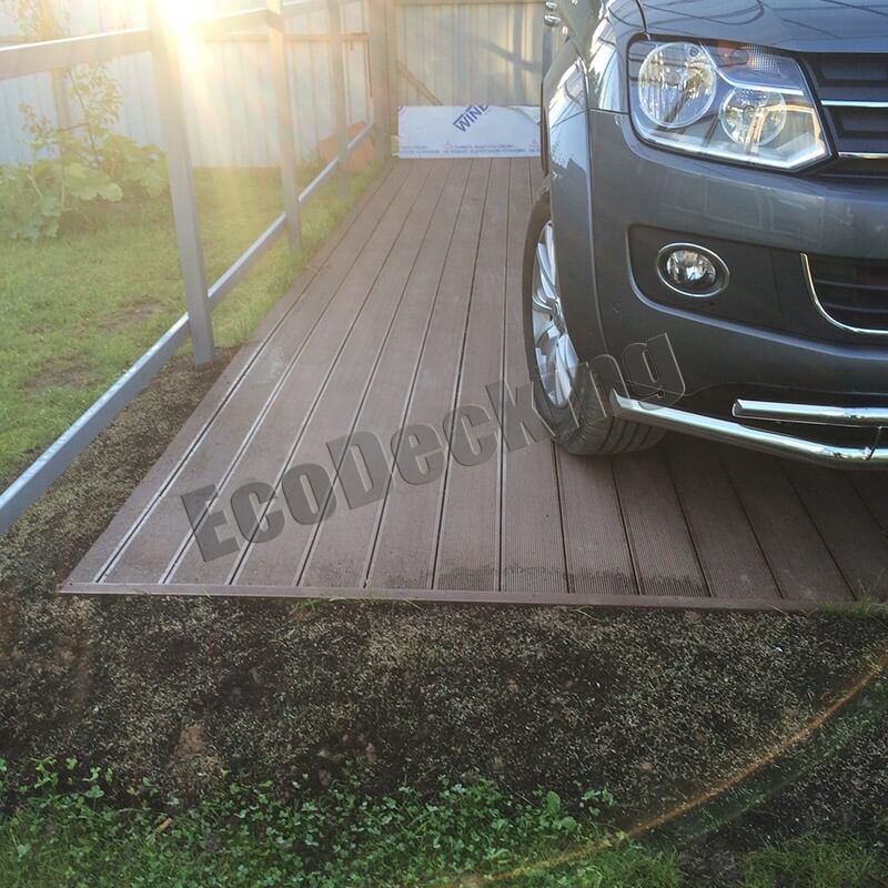 Учитывая факт, что автомобиль владельца обладает значительной массой, нашими специалистами было выполнено дополнительное усиление площадки. Поэтому декинг остается в первоначальном состоянии и не деформируется при длительной нагрузке.