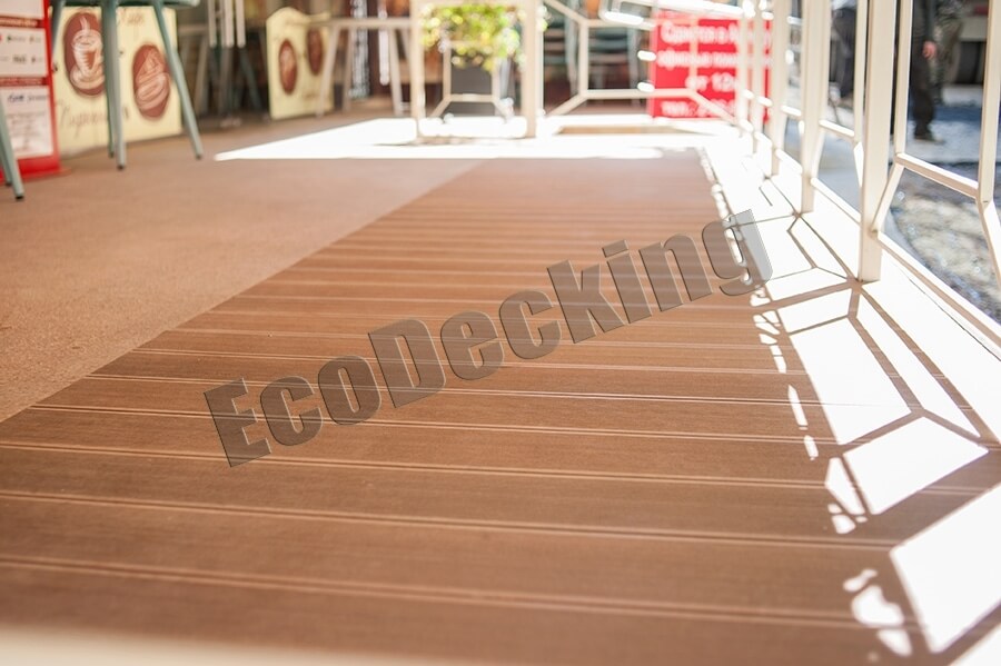 Наша компания поставила продукцию и сделала монтаж для легкой внесезонной террасы. Заказчиком была выбрана террасную доску из ДПК ECODECKING цвета "Кофе", которая имеет 2 рабочие поверхности – "вельвет" и "тиснение".