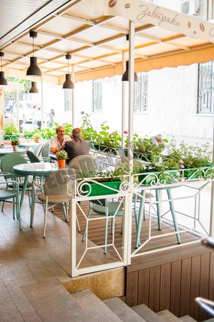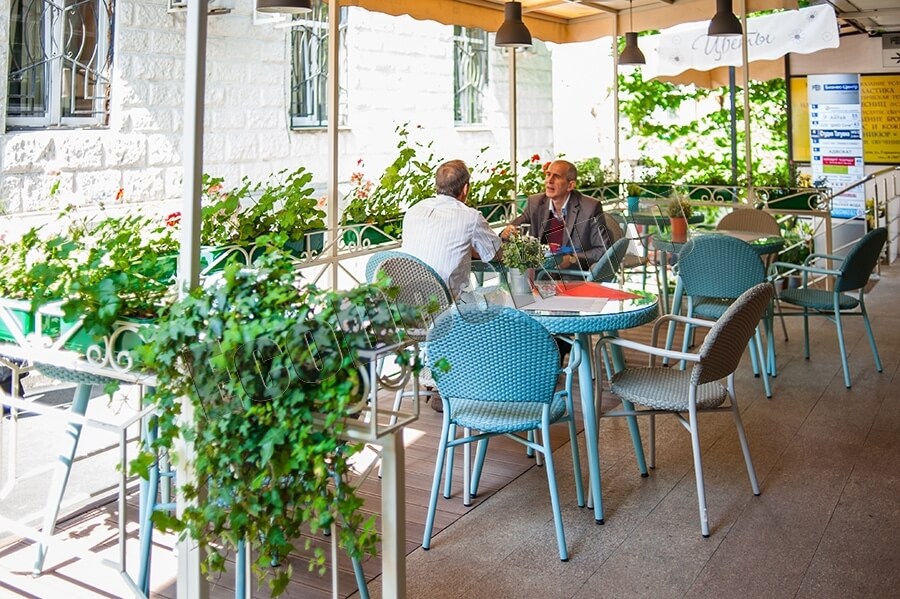 Для фронтона напольного покрытия использована сторона с тиснением, а для горизонтального настила – сторона "вельвет". Такое сочетание позволило добиться удобства эксплуатации и неповторимого образа летней террасы.