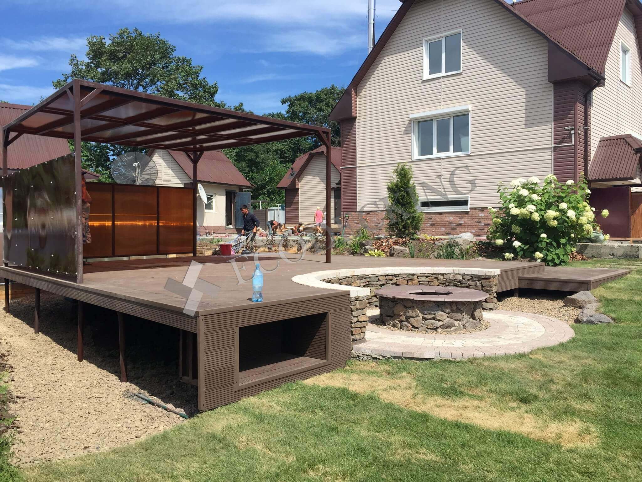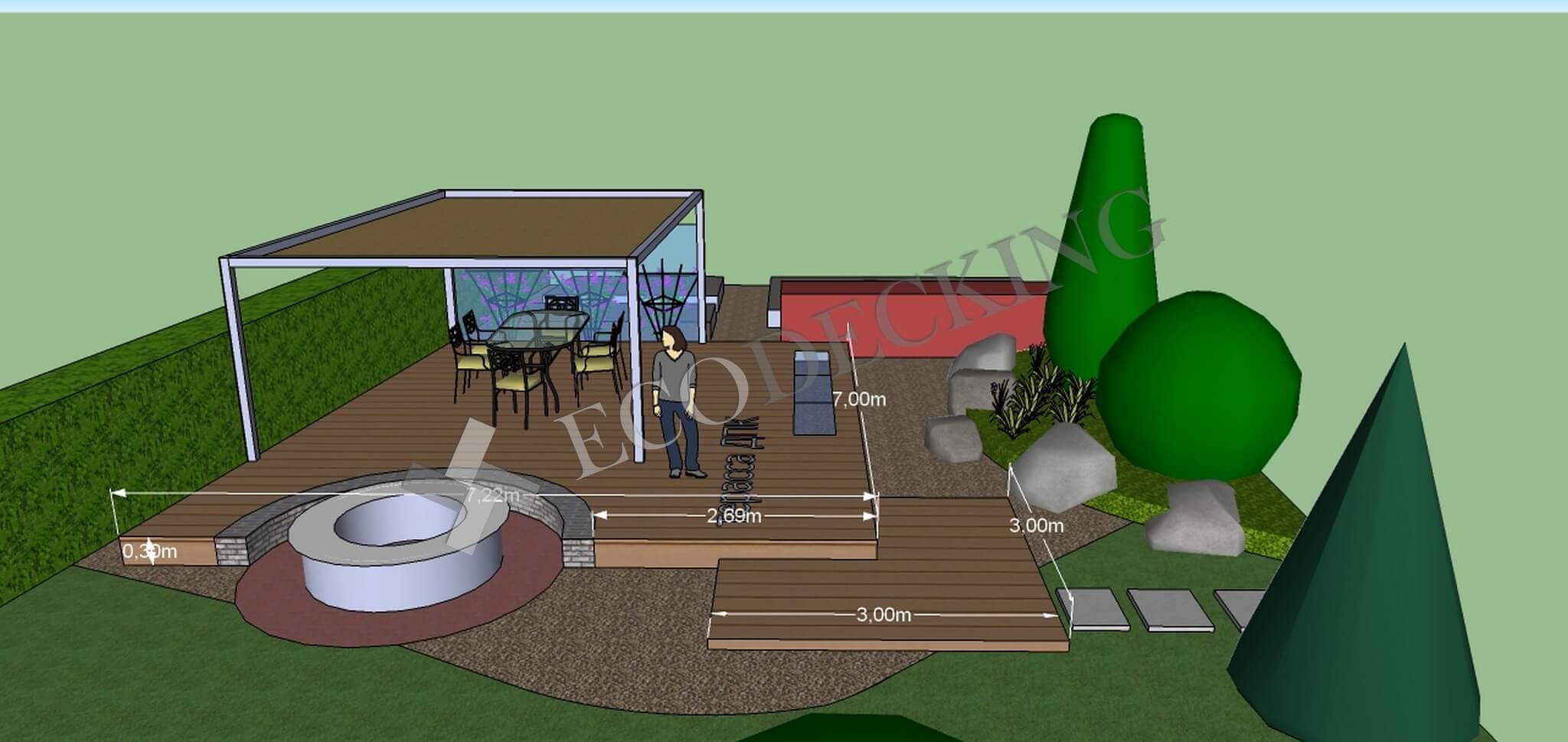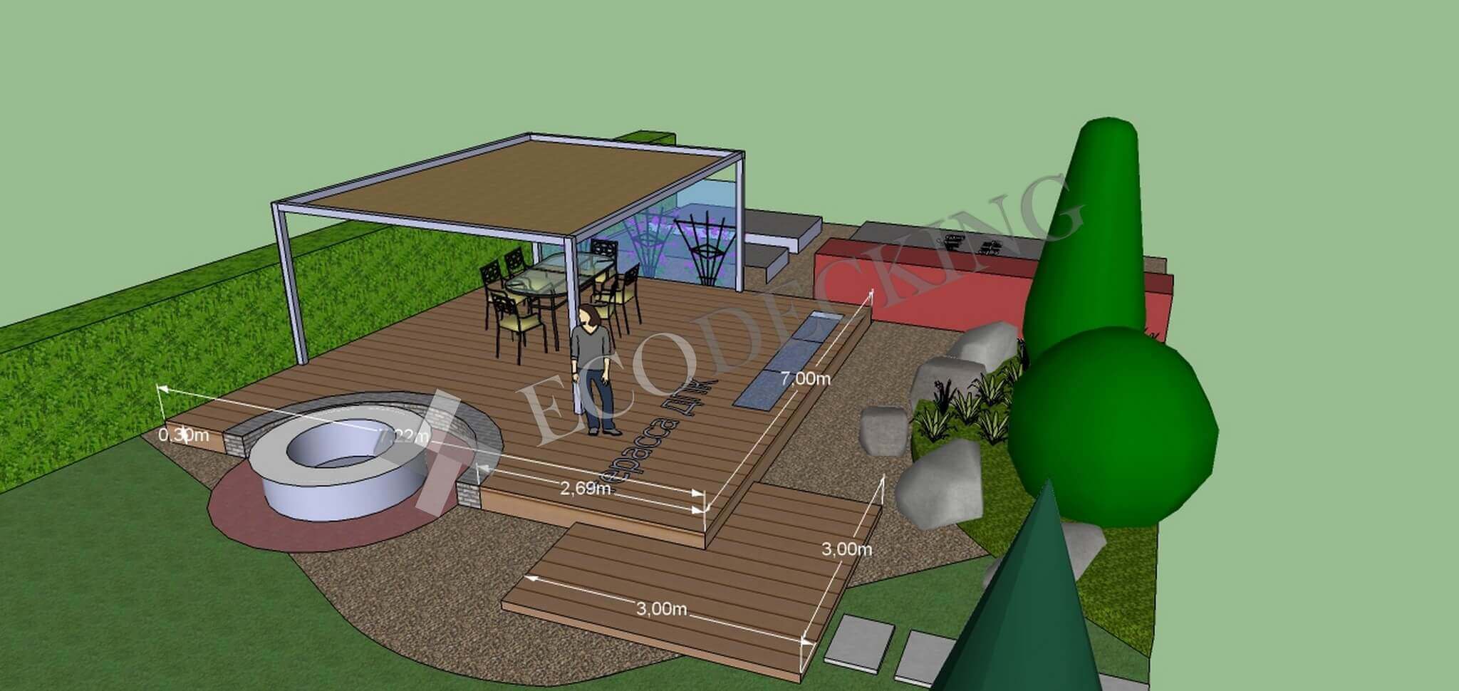У заказчика был проект террасы с беседкой, который мы воплотили. Площадь объекта около 30 кв.м., предварительно был собран металлокаркас из профильной трубы с учетом предполагаемой нагрузки. Хозяева получили эстетичное напольное покрытие для улицы, которое не требует особого ухода, выдерживает нагрузку, и долго прослужит при правильной эксплуатации. В солнечные дни здесь будет особенно приятно ходить босиком, т.к. террасная доска ДКП теплая и приятная тактильно. В уходе она не привередлива: ее достаточно подметать, можно мыть проточной водой.