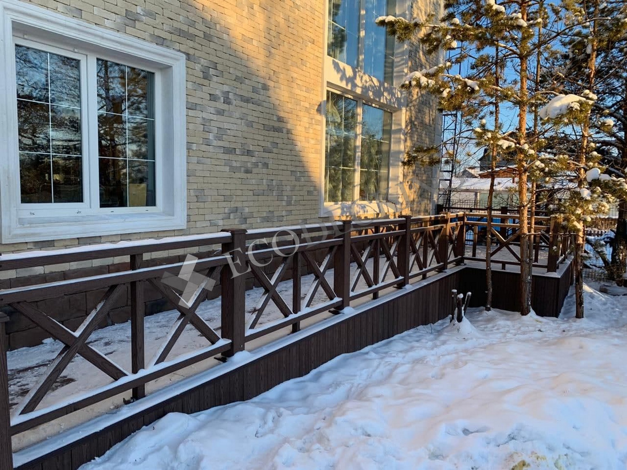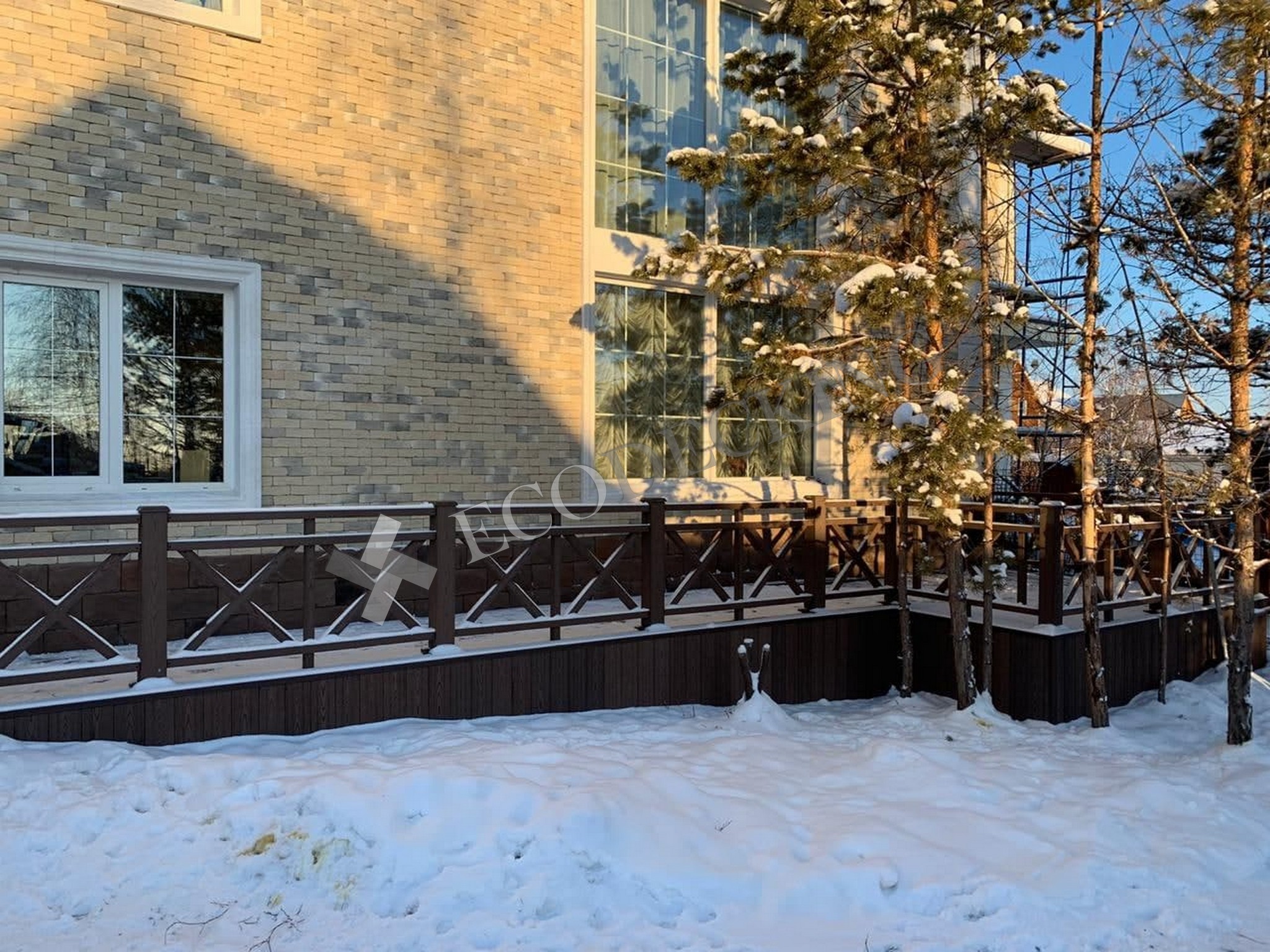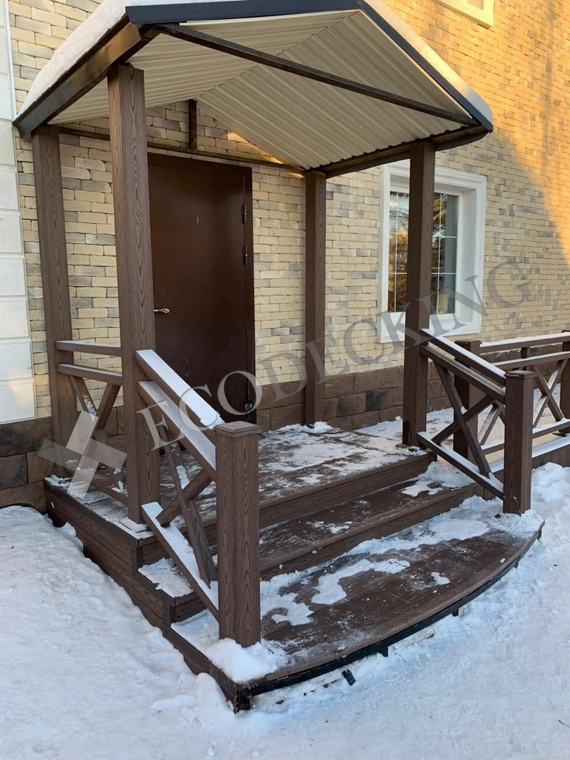 На объекте в Якутии мы установили ограждения и ступени ДПК и террасную доску Техно цвета “Шоколад”. Этот материал имеет целый ряд преимуществ, одно из которых: устойчивость к холодам и температурам выше 50С. У рифленого профиля есть высокий уровень противоскольжения при влажной погоде и низкий коэффициент влагопоглощения. Такое крыльцо устойчиво к механическим повреждениям и прослужит хозяевам более 20 лет.