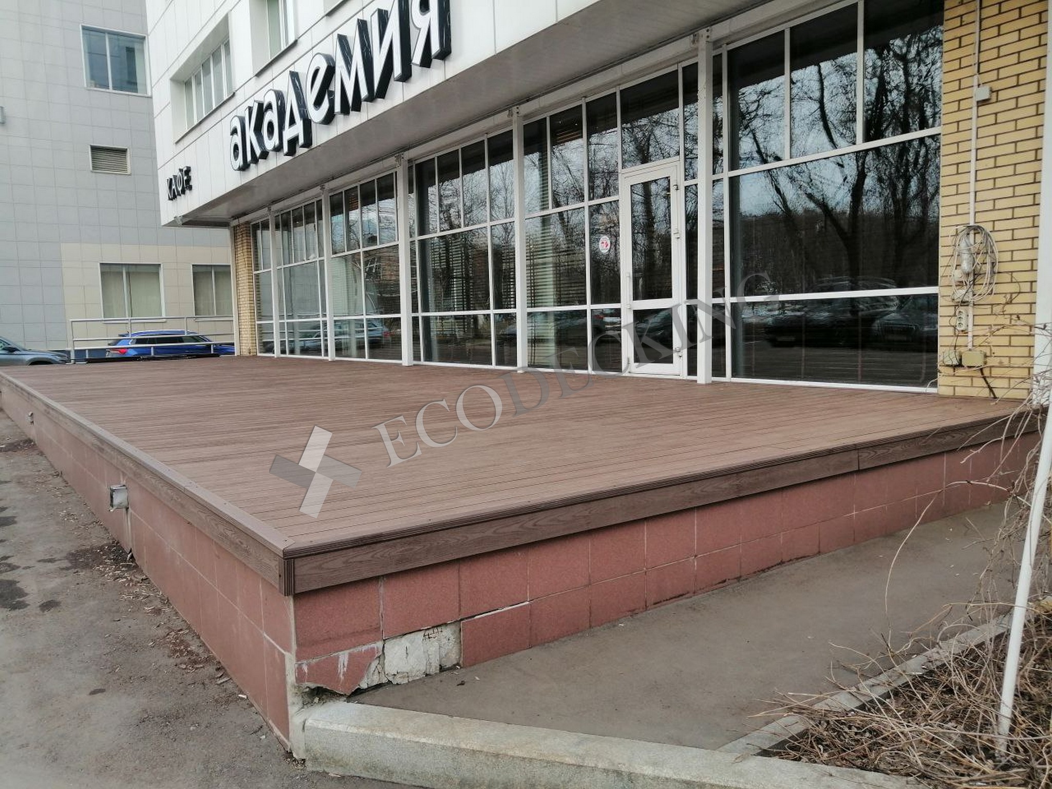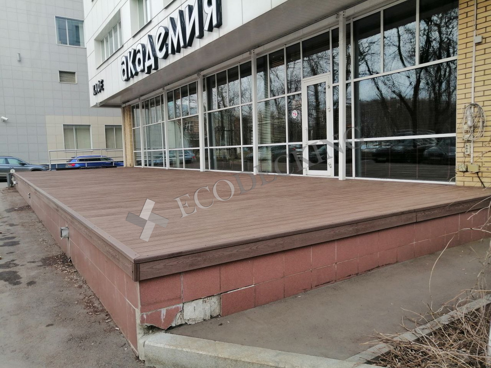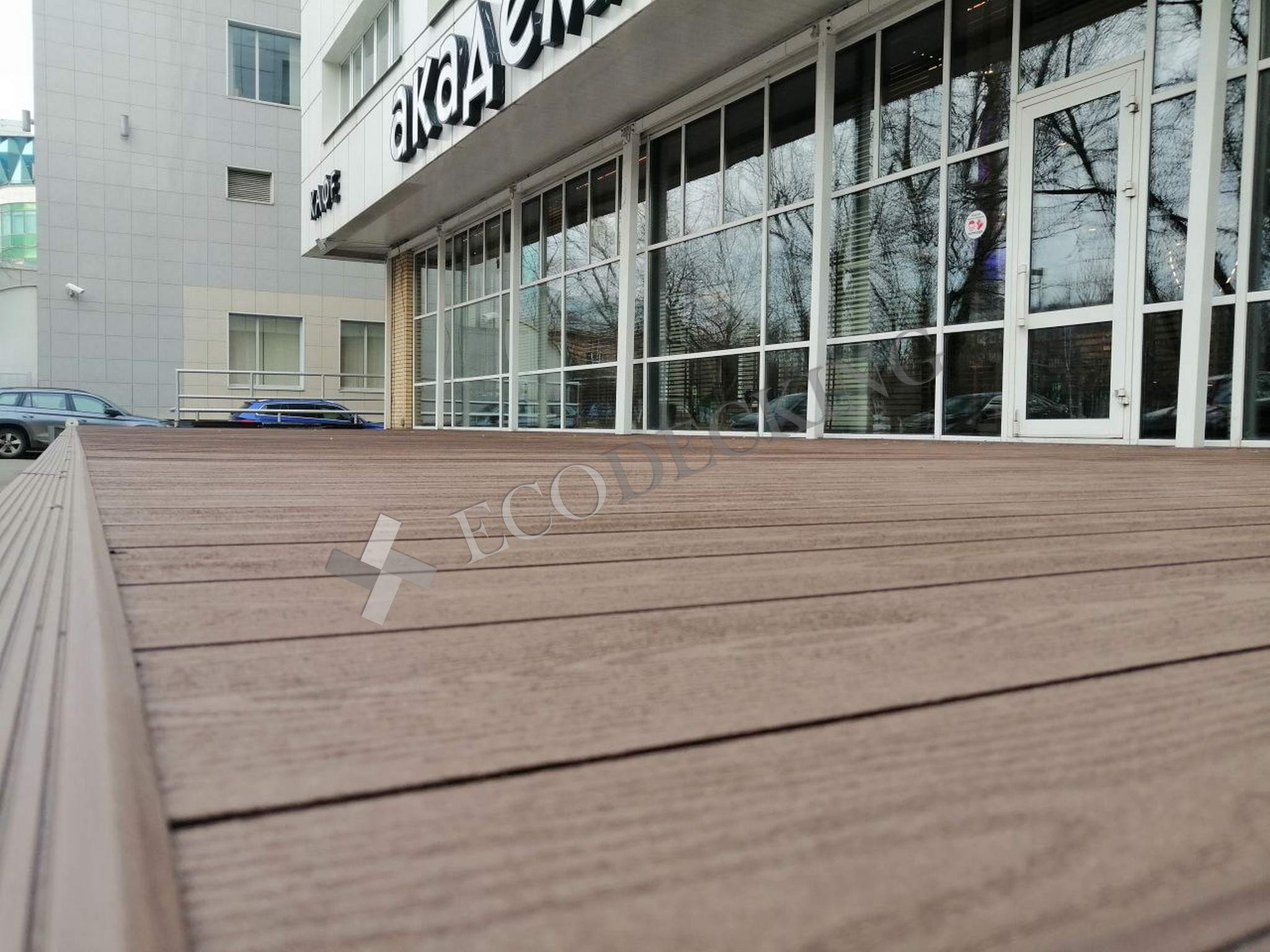 Террасная доска серии Техно была постелена на террасе кафе «Академия» Монтаж выполняли 04.2022