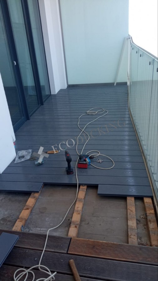 Замена деревянной доски на балконе — процесс демонтажа старой деревянной доски и установки новой террасной доски Ecodecking Титан.