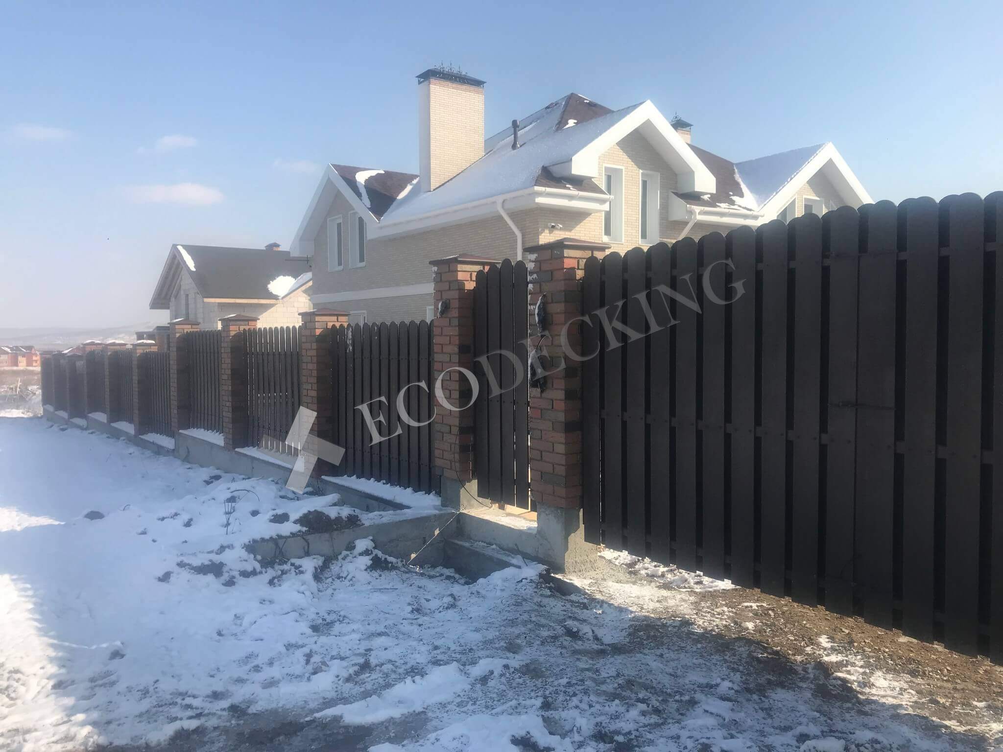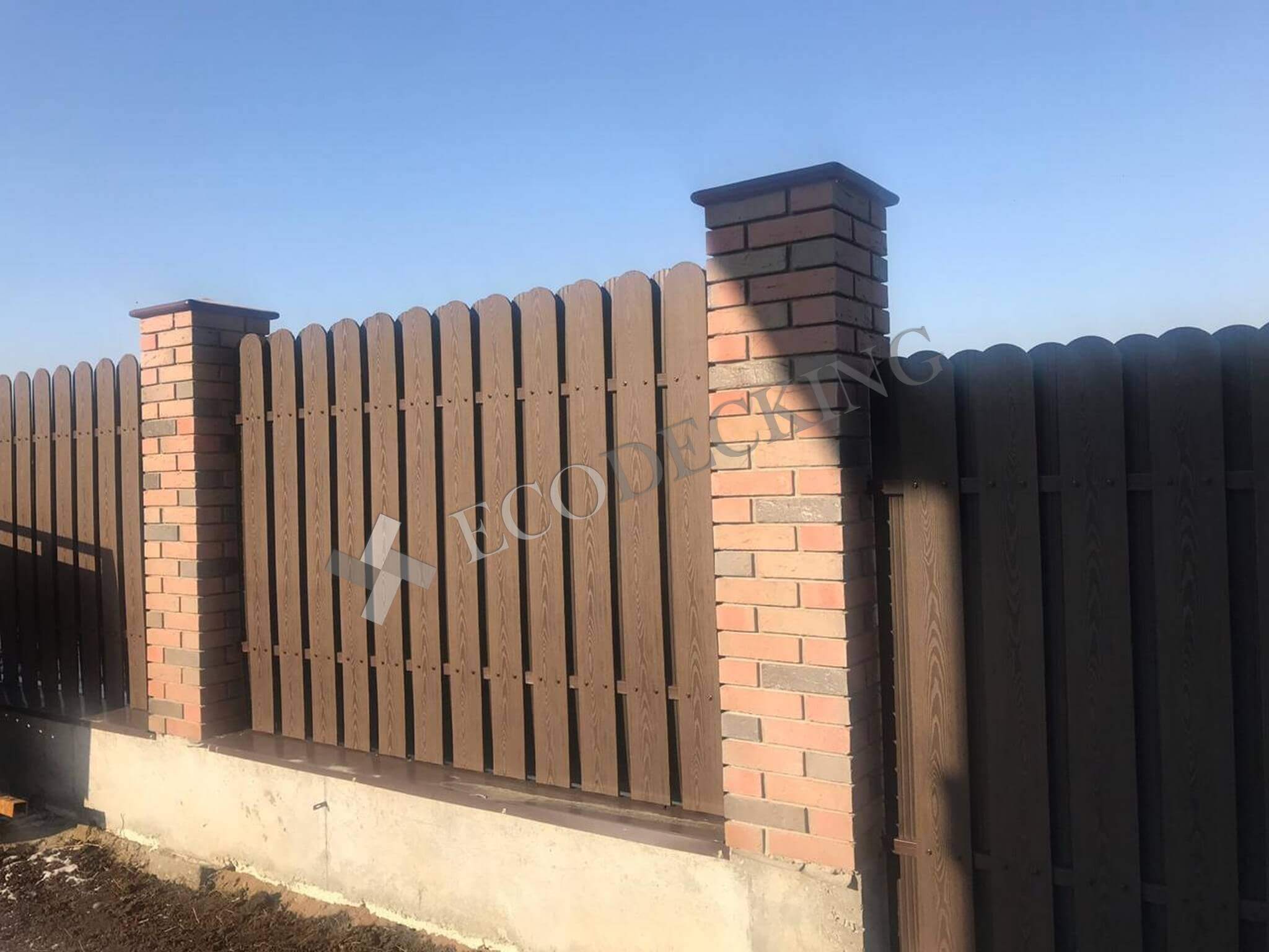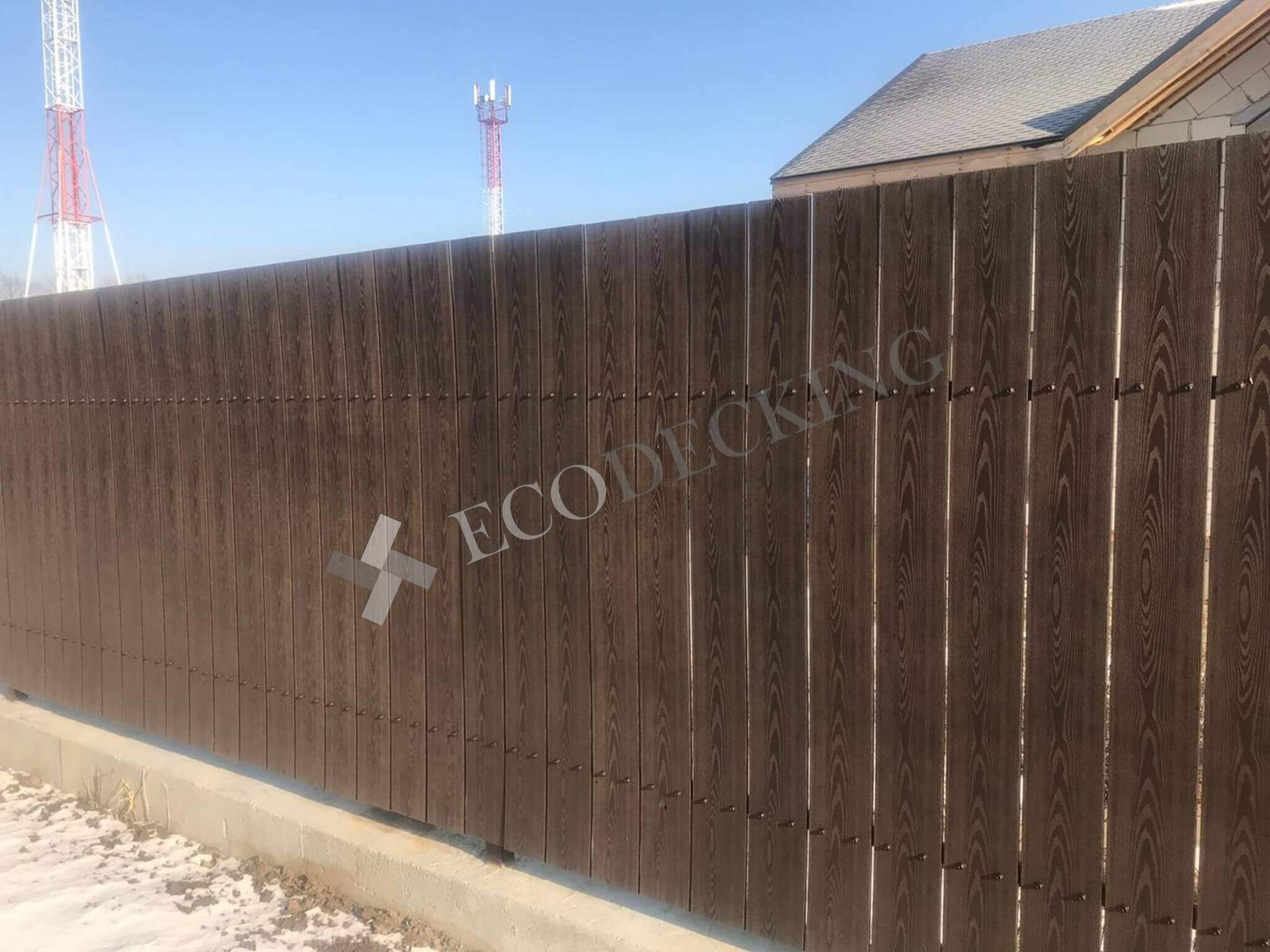 Заборная доска Ecodecking Classic цвет шоколад размер 11х145 выполняли монтаж у клиента в городе Южно Сахалинск на острове Сахалин в самом восточном крае нашей страны. Выполняли закругление доски по просьбе клиента. Было выполнено 2 варианта сборки забора: 1. Сплошной штакетник 2. Штакетник двухрядный. Результатом клиент удовлетворен.