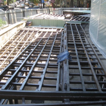 Если террасную доску необходимо установить на месте где уже есть металлический профиль, то проще всего добавить направляющие из того же металла, сварив лаги террасы и текущее основание в один каркас.При этом необходимо соблюсти рекомендованное расстояние между лагами 35-40 см.