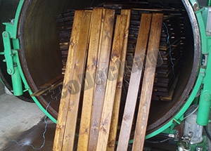 В начале подсушенная древесина помещается для обработки в специализированную камеру, в которой создается вакуумная среда. На этом этапе из структуры древесины выдавливается воздух и остатки влаги.
